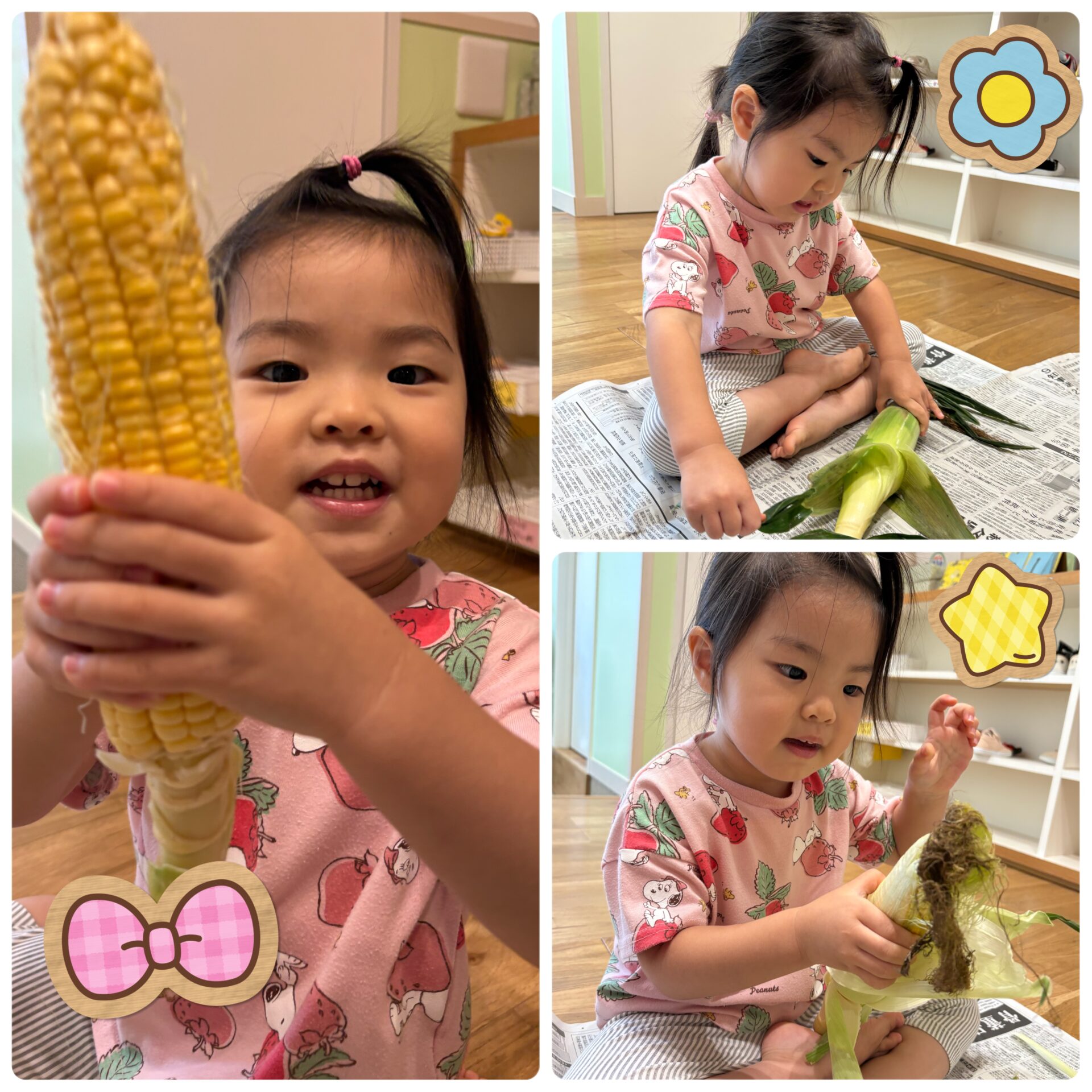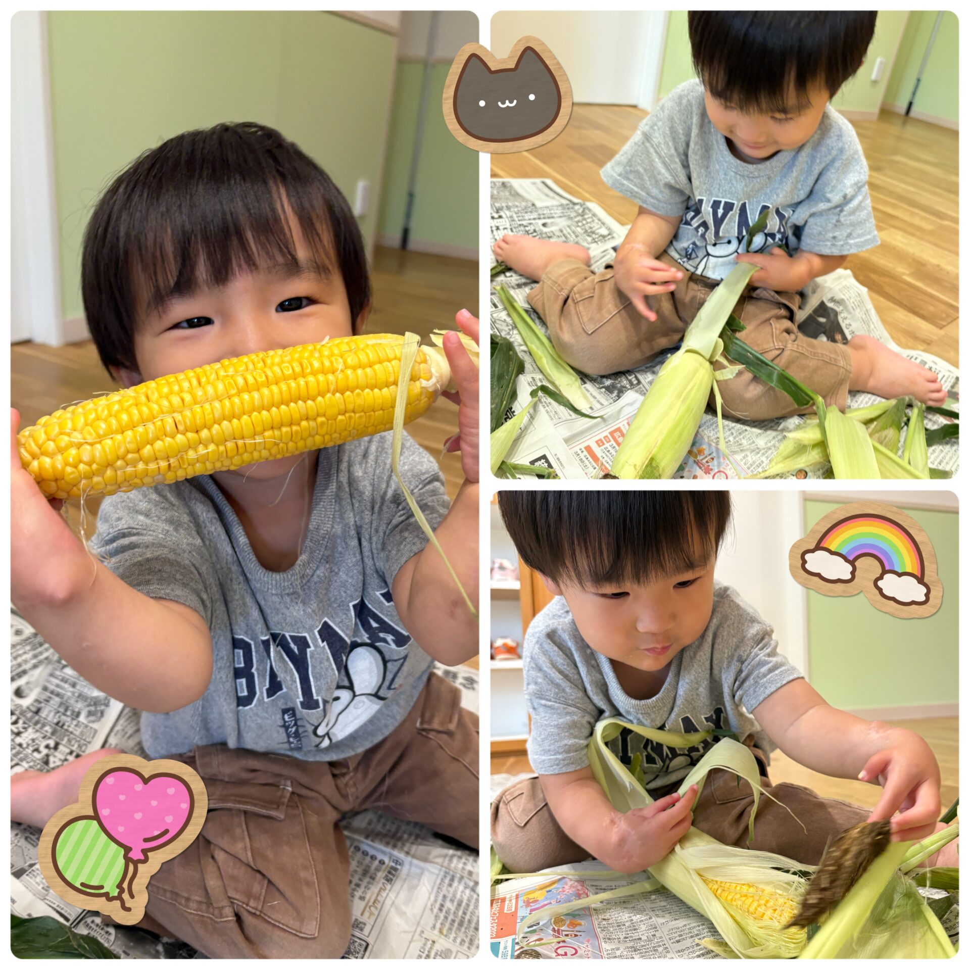 今日の午後おやつはとうもろこしだったので、大きいさんのAちゃんとYくんに、とうもろこしの皮をむいてもらいました😊