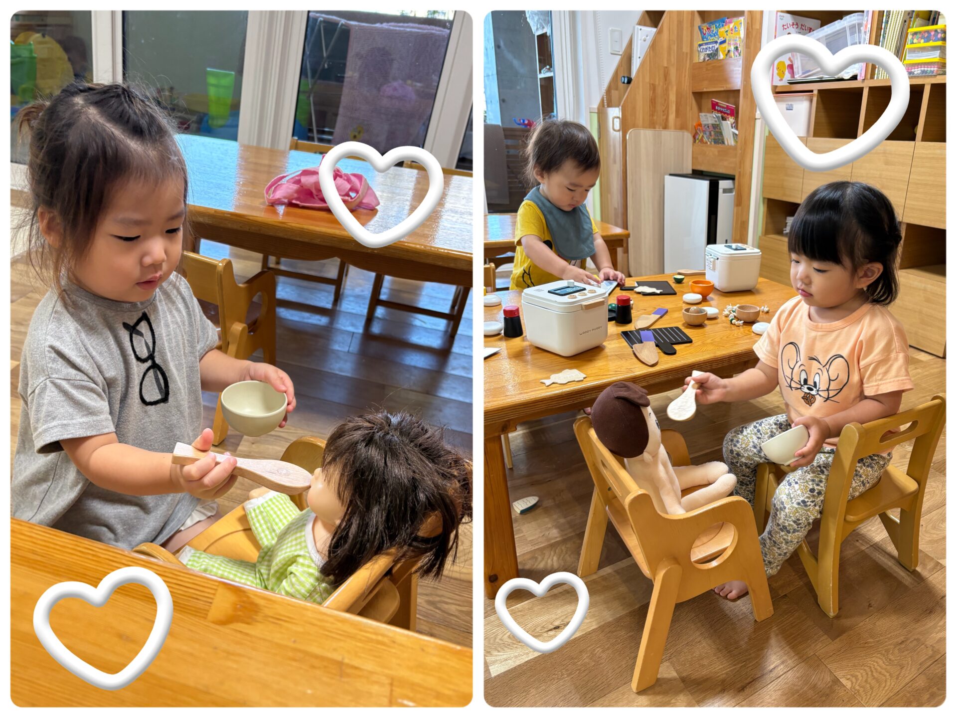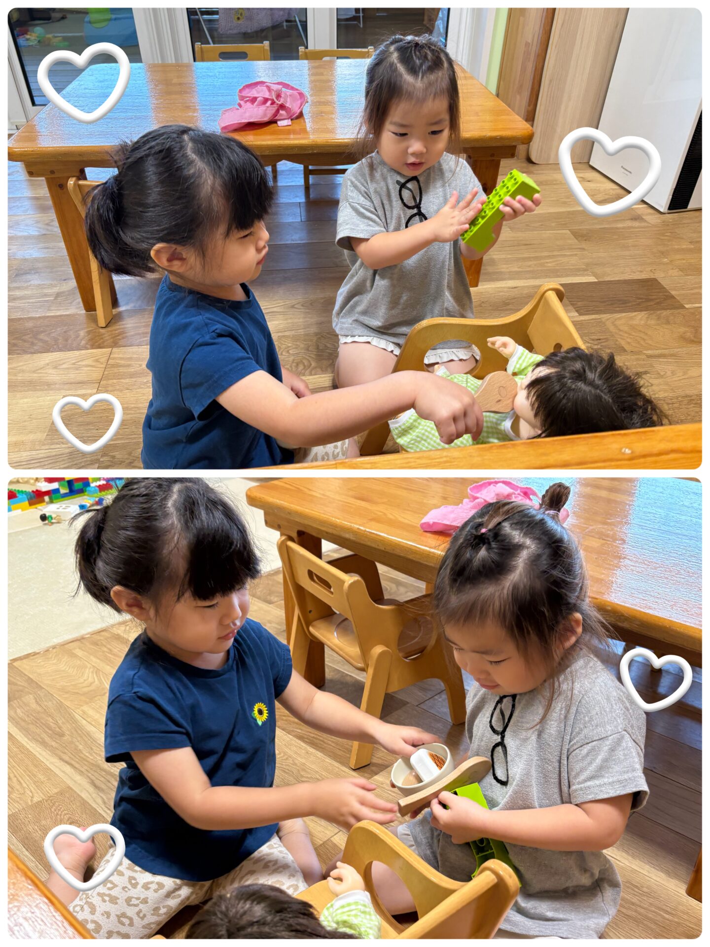 午後の遊びの時間にはTちゃん、Rちゃん、Iちゃんは赤ちゃんのお世話をしていました💕