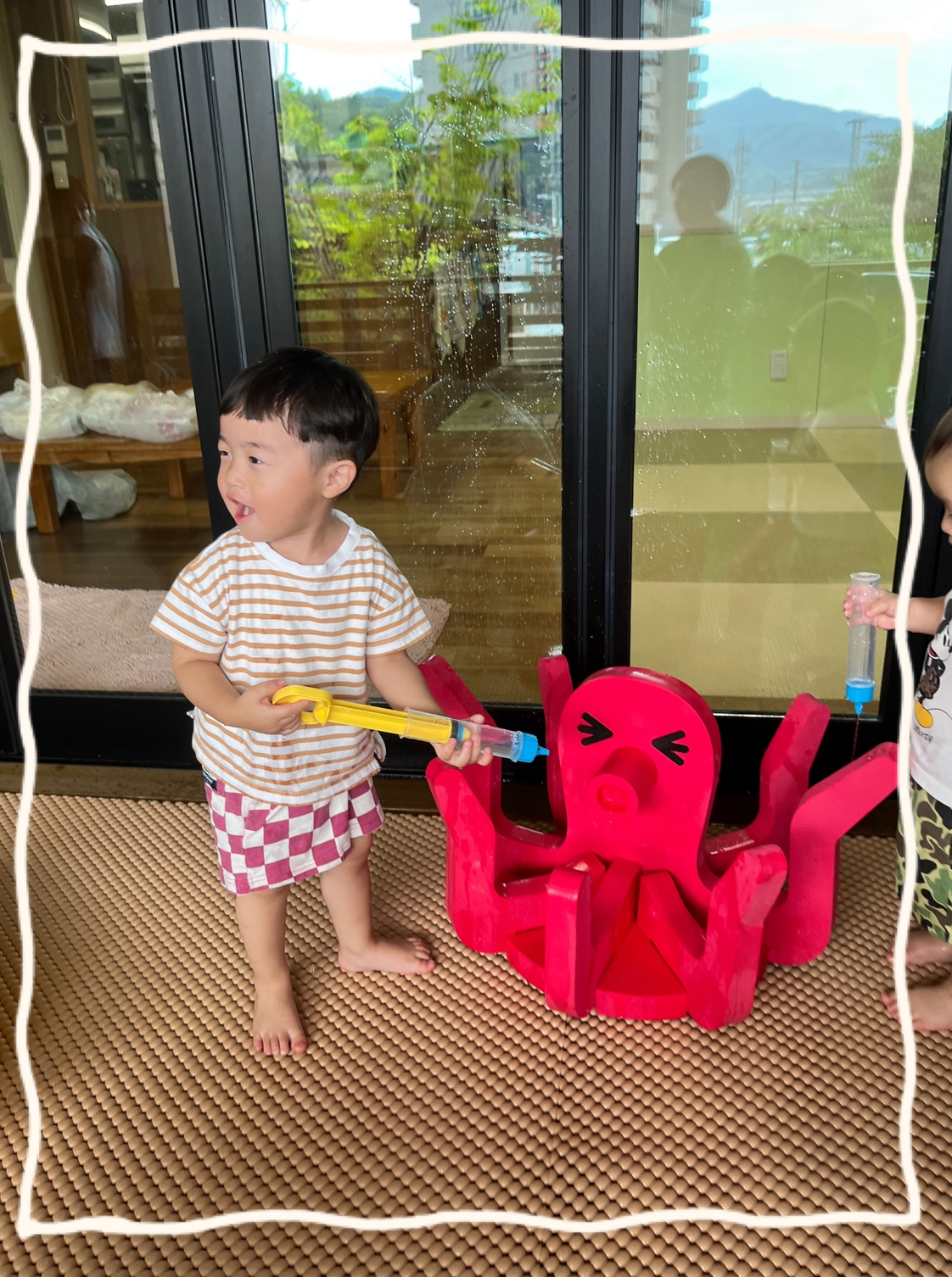 その様子を見て水でっぽうを手に取り、試行錯誤した結果、コップがわりにしてお水を汲み、タコさんに飲ませてあげる小さいさんのHくん😆