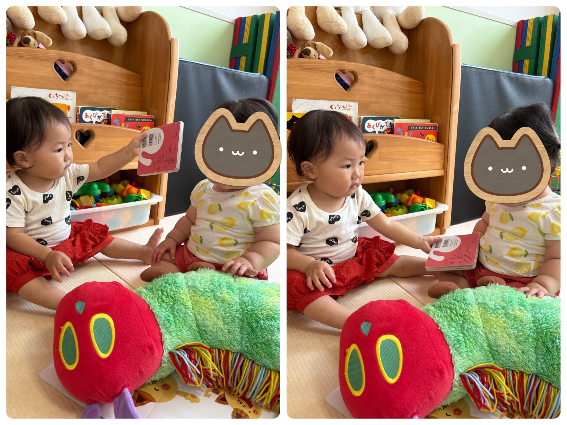 それぞれに自分の好きな玩具や絵本を読んで遊んでいましたが、お友だちが持っているものに興味がわいて、手が伸びます🖐️