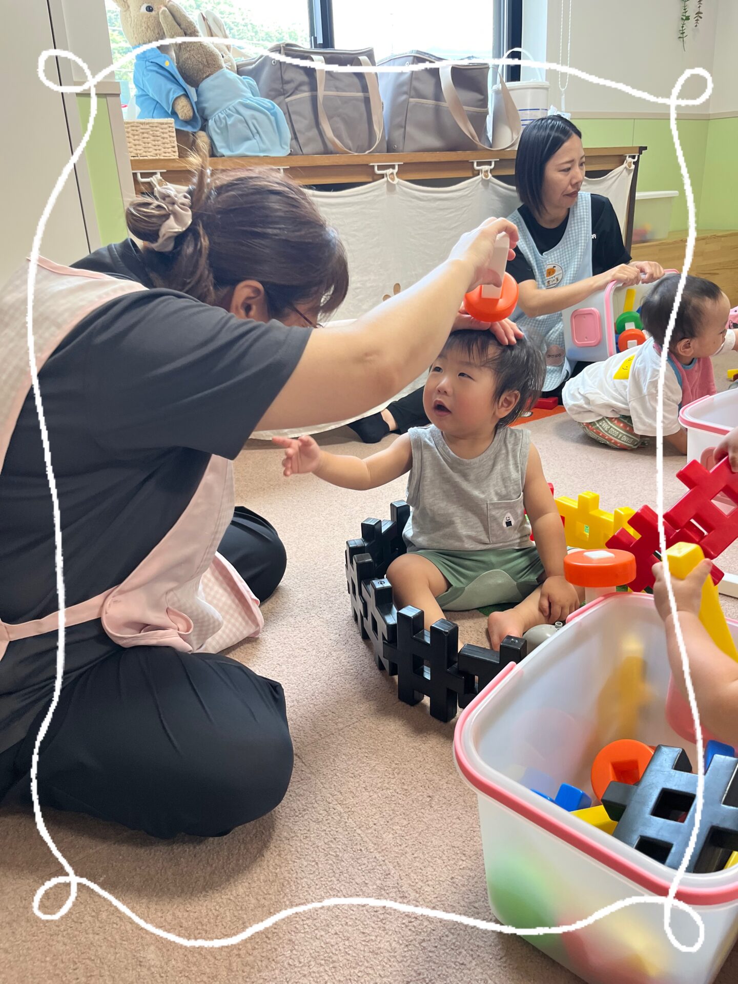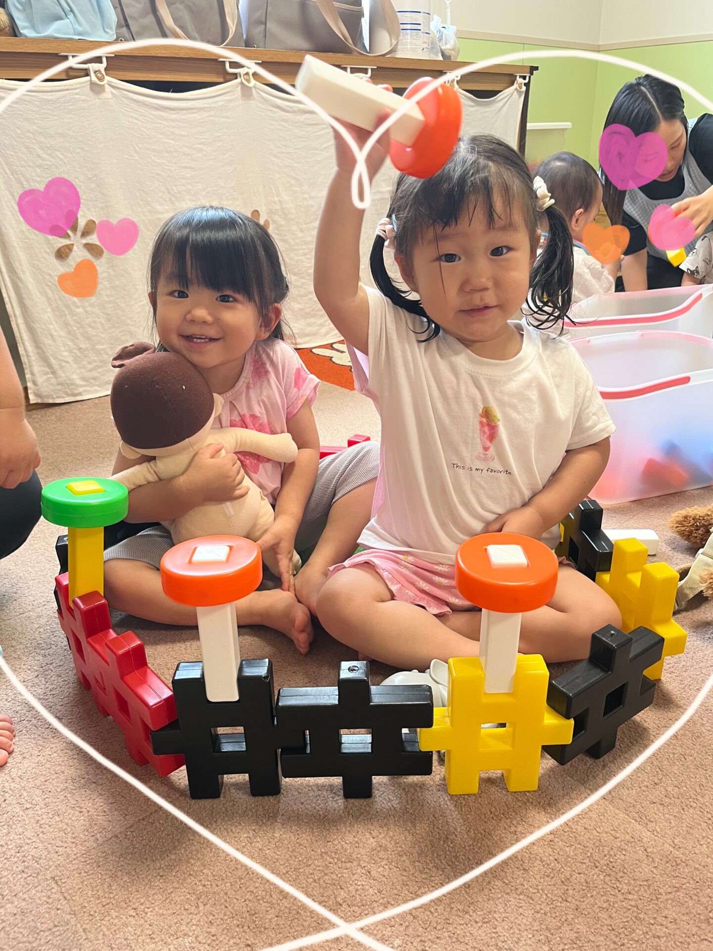 そして、水遊びの後のお部屋遊びでは、Y先生がブロックで作ってくれたお風呂とシャワーで盛り上がりました😆🚿