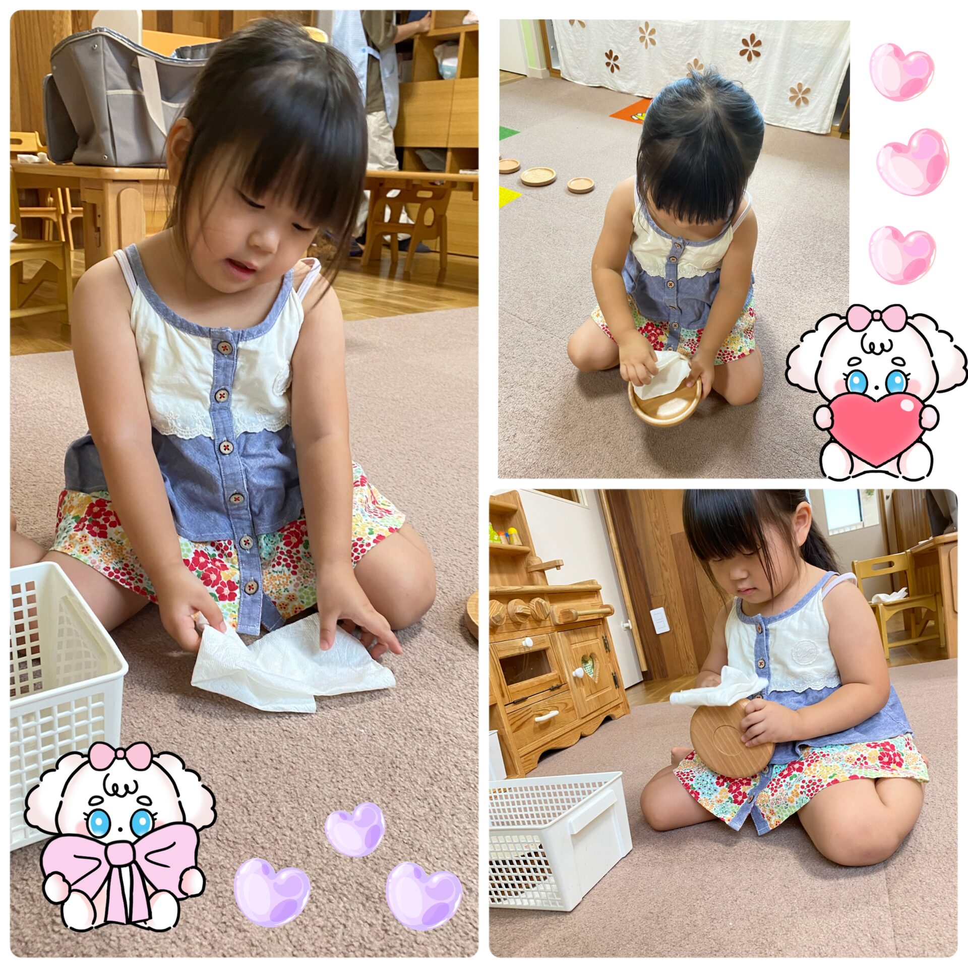 ペーパーをたたんで、「見ててね~、こうやって拭くんだよ✨」と上手に拭く様子を見せてくれました👀