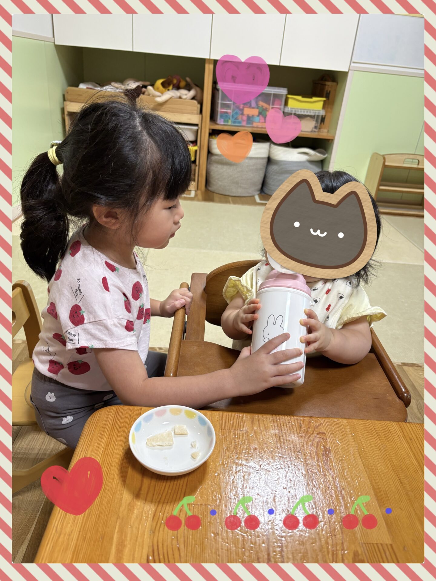 大きいさんのIちゃんが、 Mちゃんの水筒をそっと支えてあげていました✨