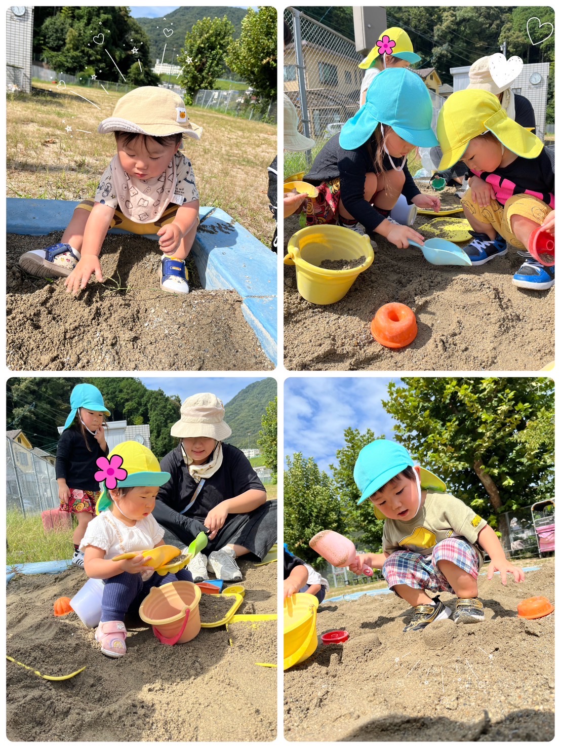 お砂場道具を持っていき、お砂場で遊びました💚 昨日の雨で砂が少し濡れていて 型抜きで、ドーナツや🍩プリンを🍮