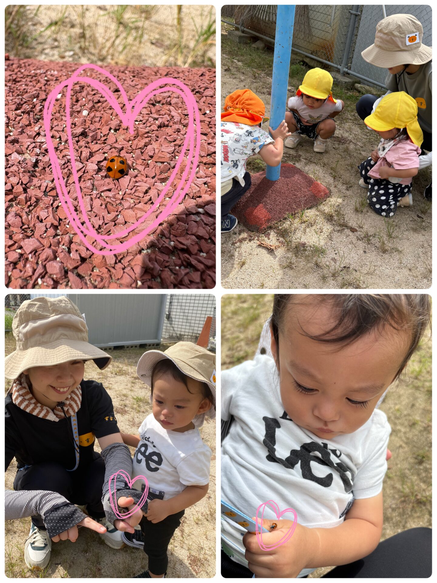 YくんはN先生の手にのっているのを見て「Yも!!のっていいよ♪」と、手を近づけて、てんとう虫に話しかけていました☺️するとYくんの手に!!そして服の上も歩いていたのですが、「もうおりてー💦……触ったけどね、ちょっとね、怖かったんよ😝💦」と心の声を教えてくれました💓