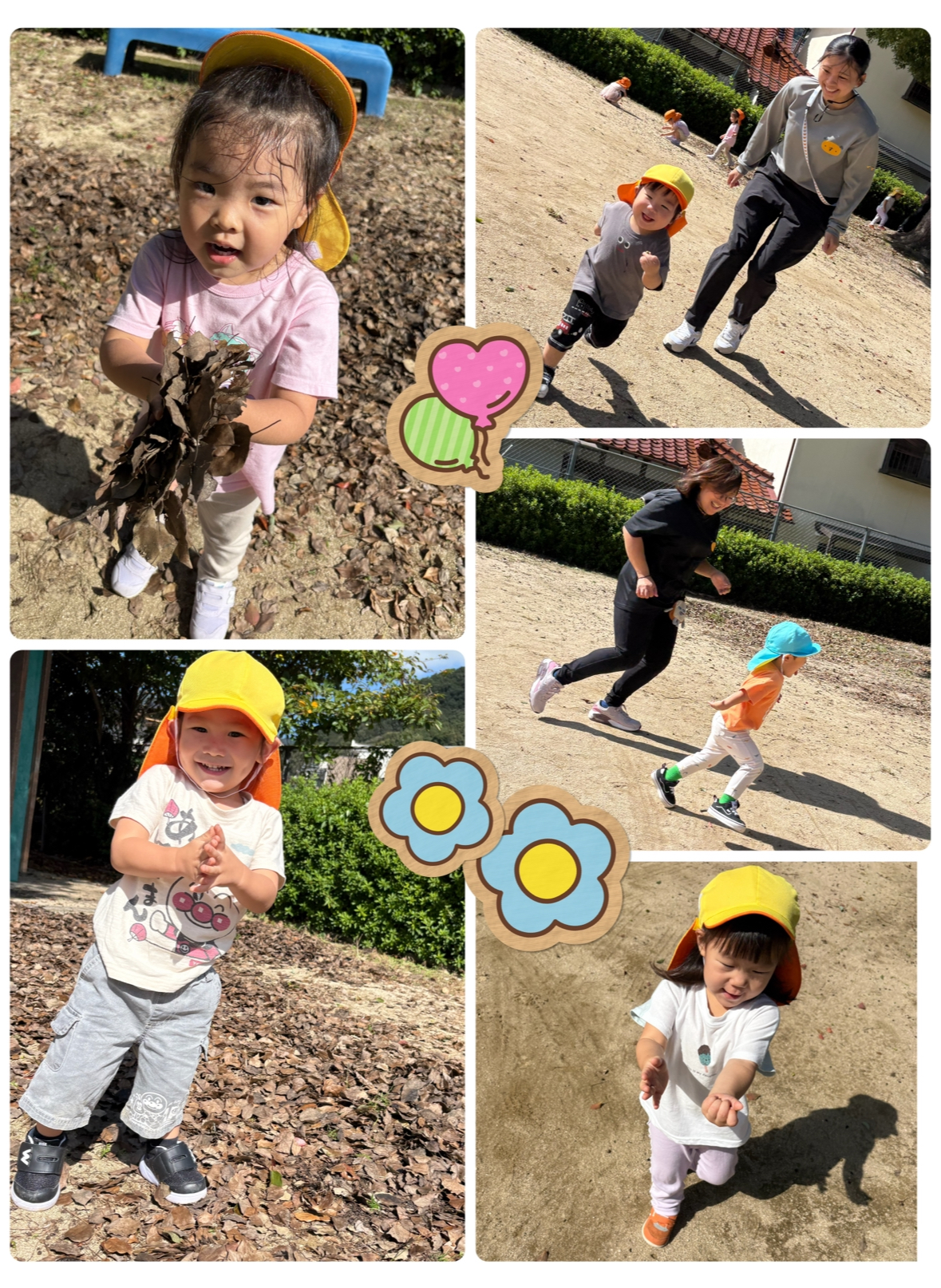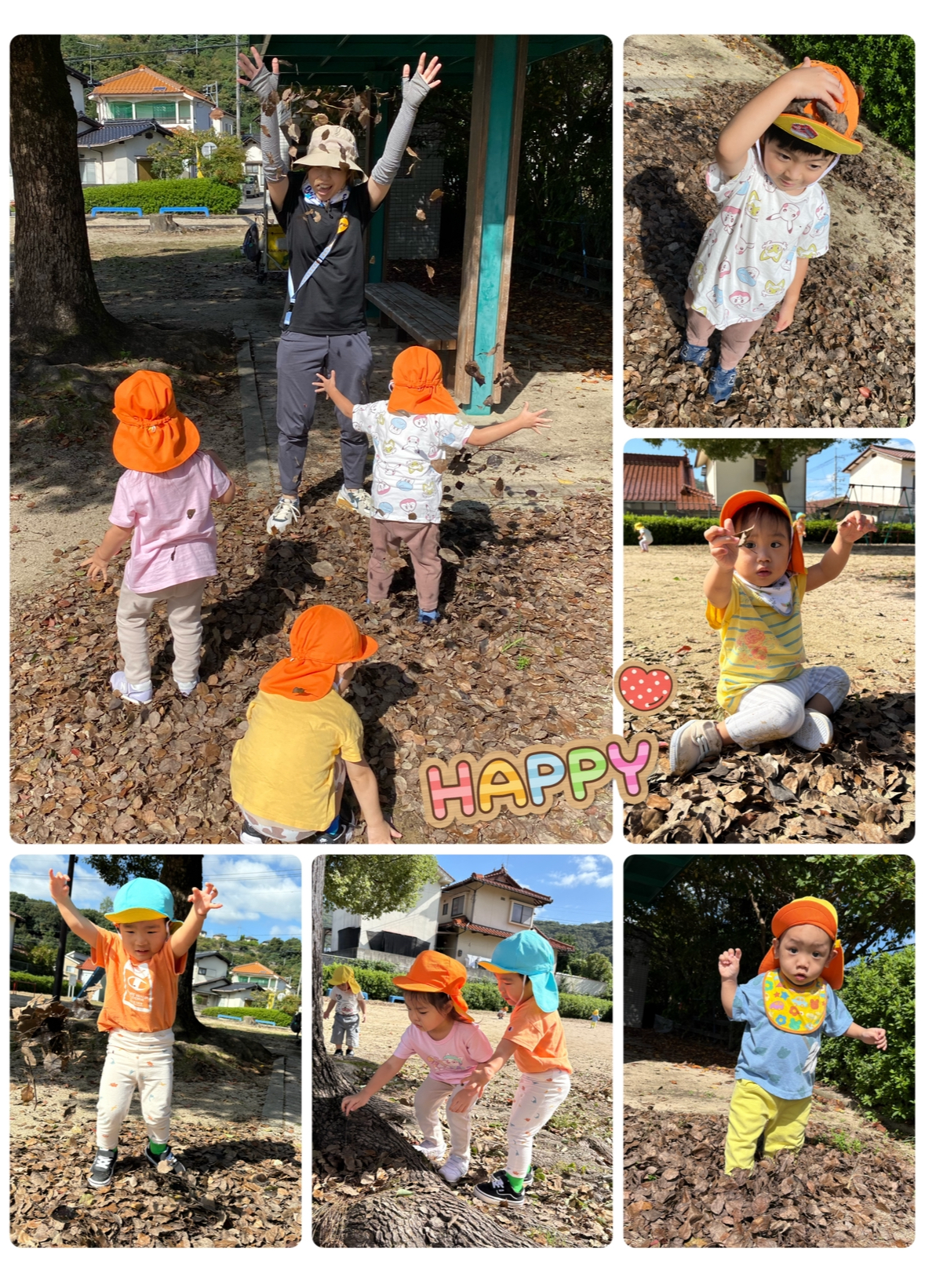 葉っぱや実を見つけて集めるすまいるのお友だち😃葉っぱを手で集めて上にパラパラ〜っとしたり、足で音を楽しむ姿も👀🌟小さな実が帽子みたいに被っているのを見つけて集めたり、これは?これは?と色んな実を見つけました🪹