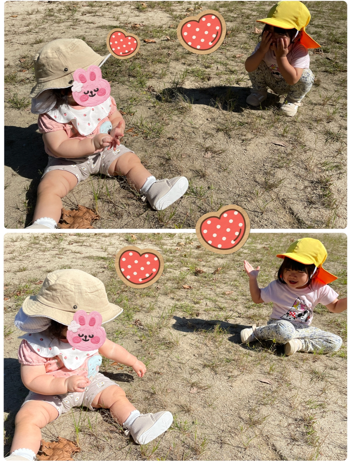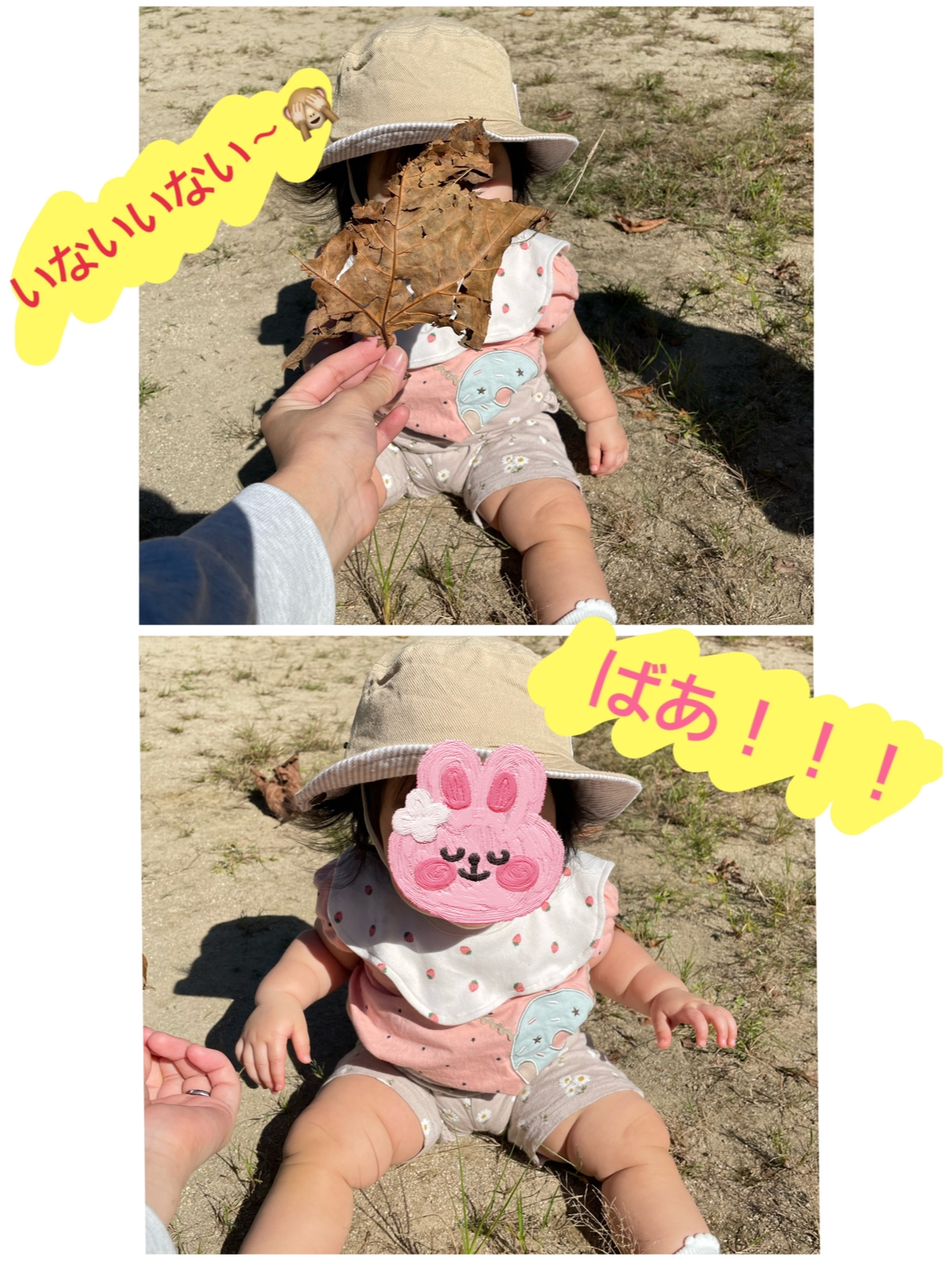 0歳のMちゃんもハイハイを沢山して、色々なものを見つけました!”うわ〜”と言いながら前に進んでいると…👀大きな葉っぱを見つけて”いないいないばあ!!”それを見ていたTちゃんも”いないいないばあ!!”と沢山してくれてホッコリ空間でした😌🤍