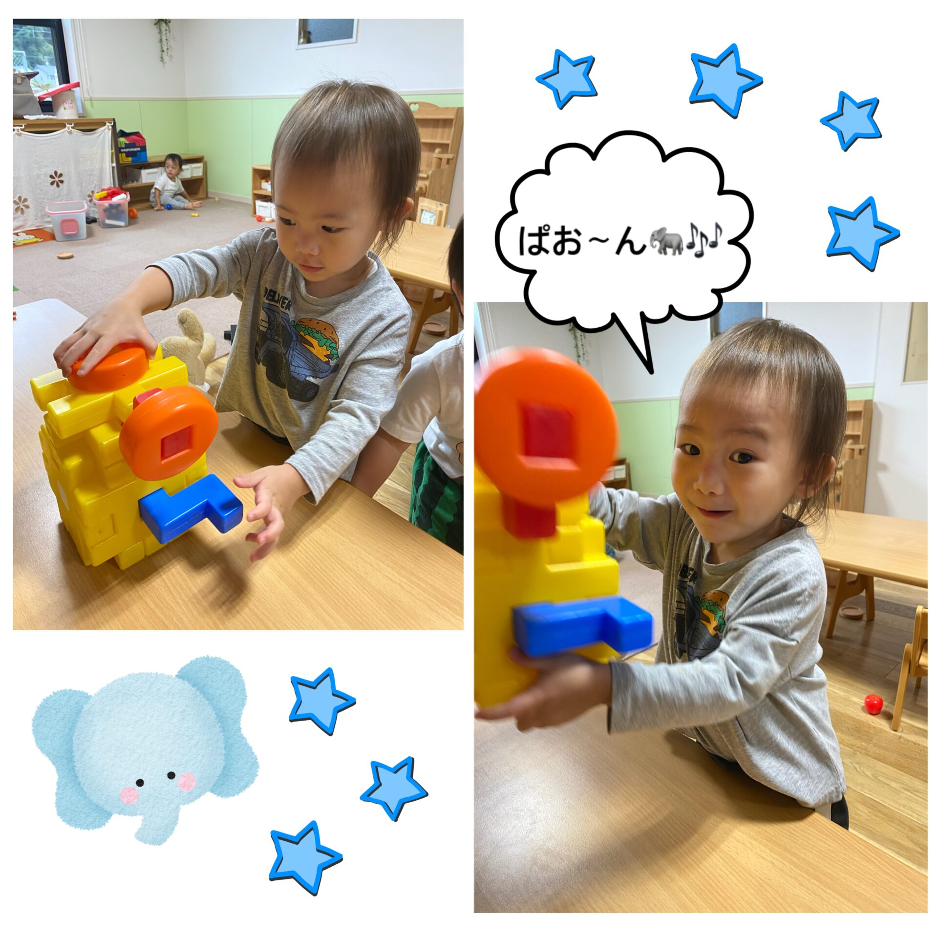 「Rくんがつくったの?🤭」と聞くと「うん😊」と嬉しそうな笑顔を見せてくれたので「何をつくったの?」と質問してみると「ぱおーん🎶」と教えてくれました🐘
