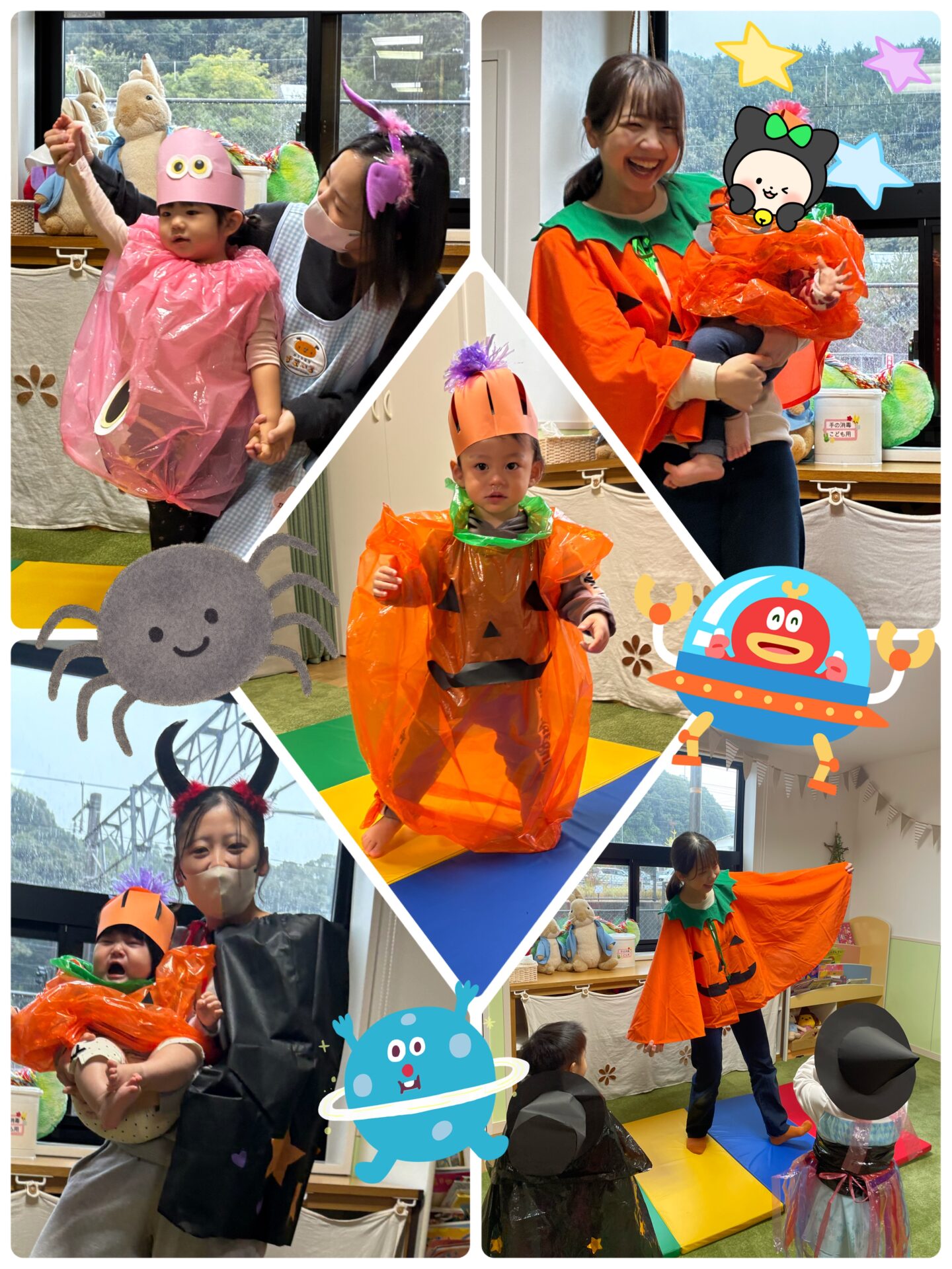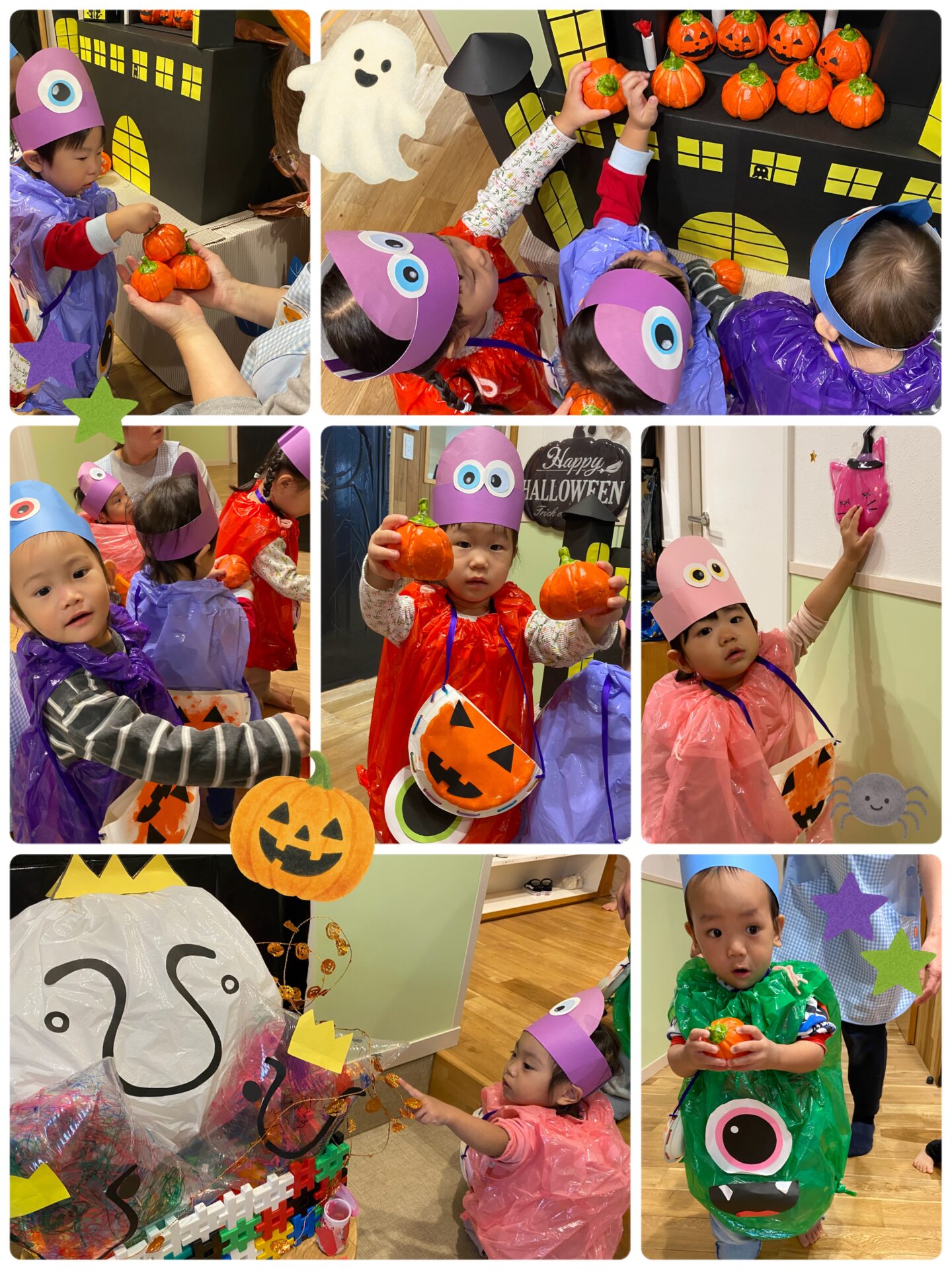 0歳児さんはふわふわのカボチャ、1歳児さんはかわいいモンスター、2歳児さんはドラキュラや魔女に大変身です。