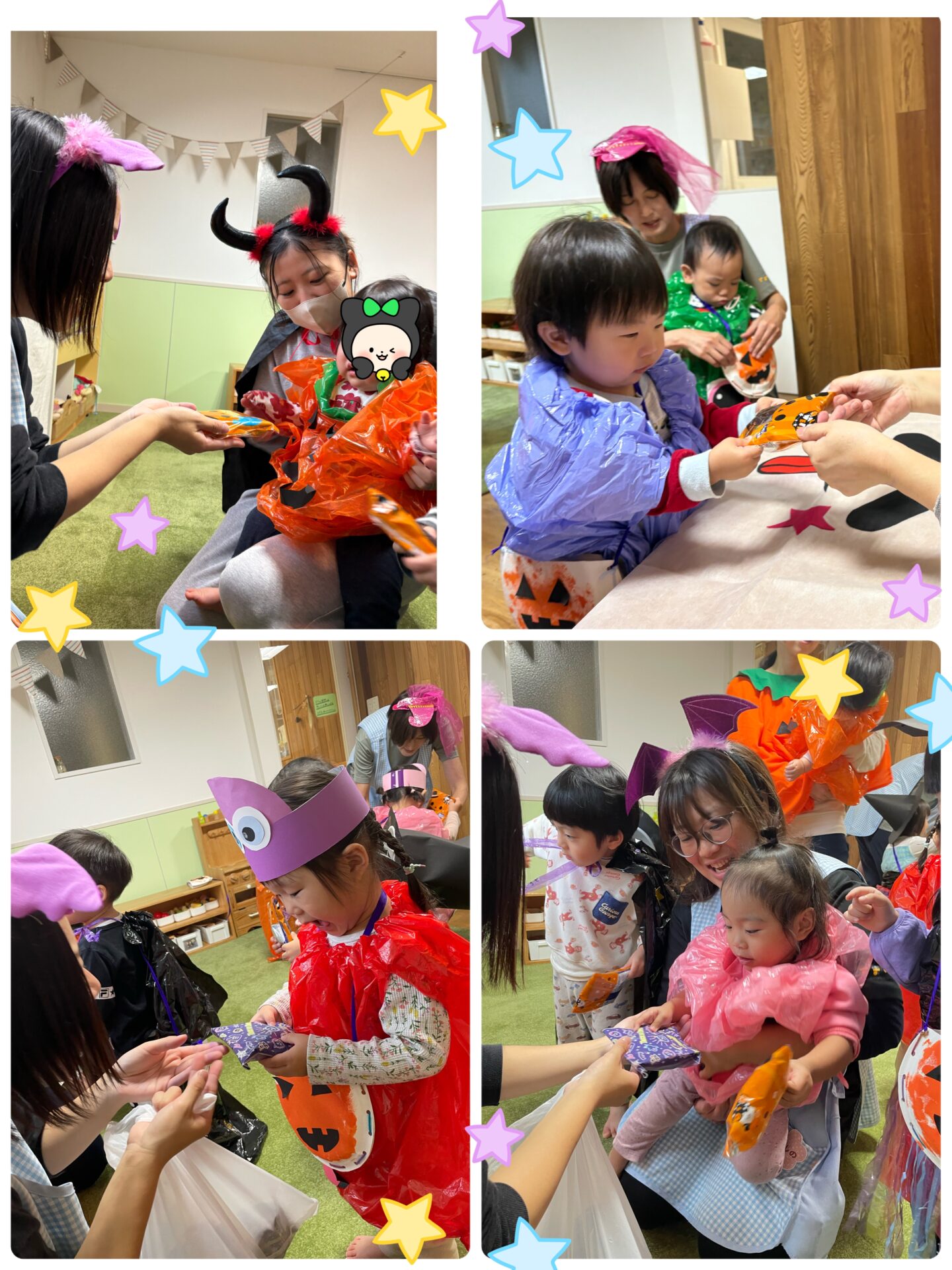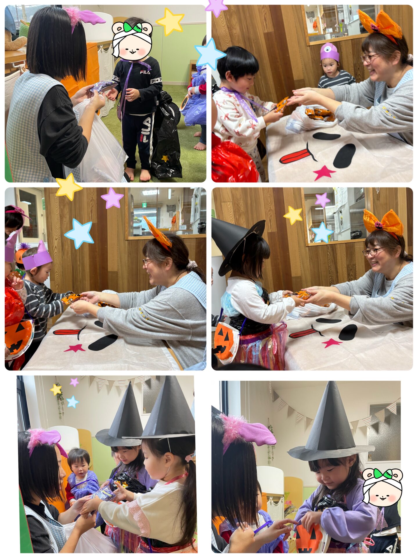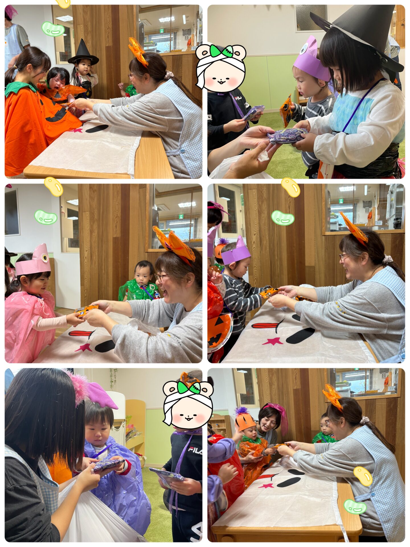 Y先生とK先生が待つお部屋に行って、元気いっぱいに「トリック・オア・トリート😈」と伝える子、ワクワクした表情で言う子、ちょっぴり恥ずかしそうに小さな声で伝える子…。