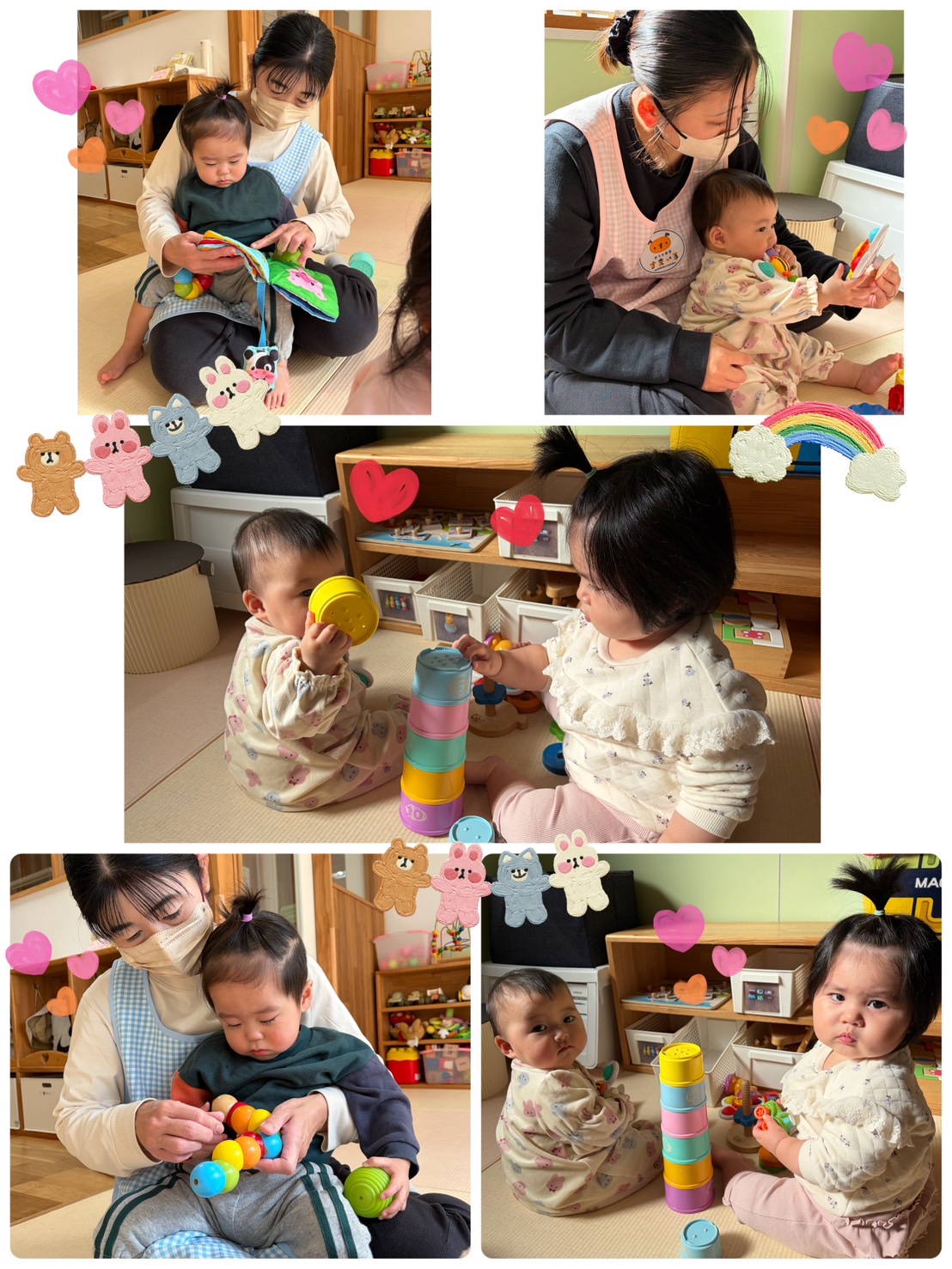色々なおもちゃを手に取り、これはなんだ?っと指先でおもちゃを使って遊んだり、保育者とお話をしながら楽しくゆったりと過ごしました♪ これから元気いっぱい楽しもうね😃