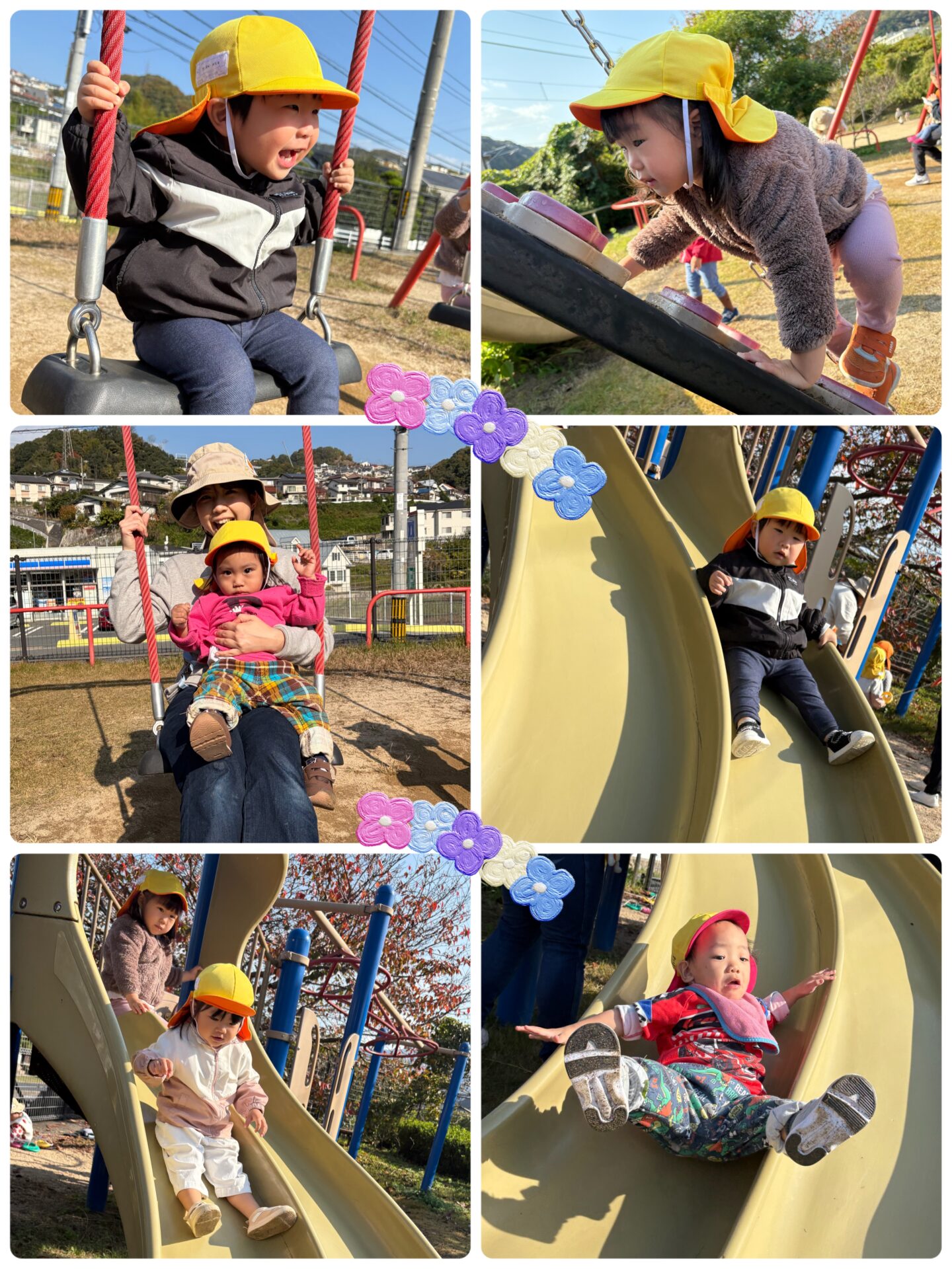 すべり台やブランコも先生のお話を聞き、お約束を守って楽しく遊びました!ブランコをお友達が使っている時は、「か〜わって!」「10秒数えよう!」と順番を待っていた大きいさん!とってもかっこよかったです✨また行こうね!