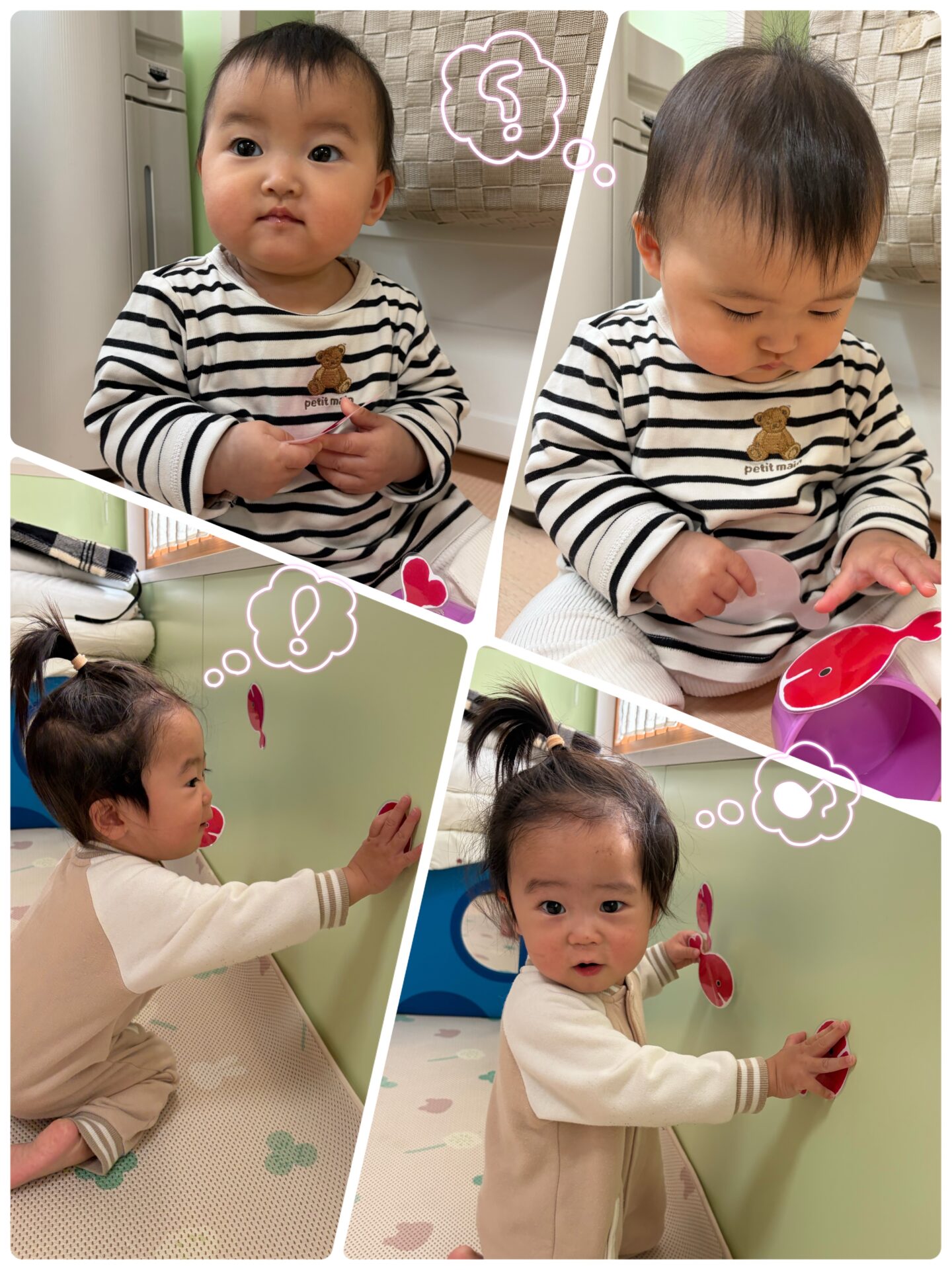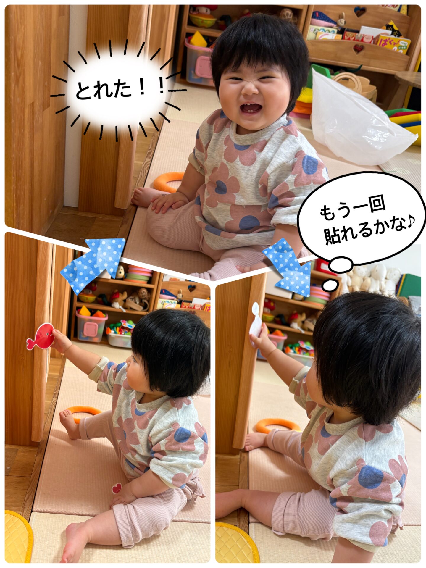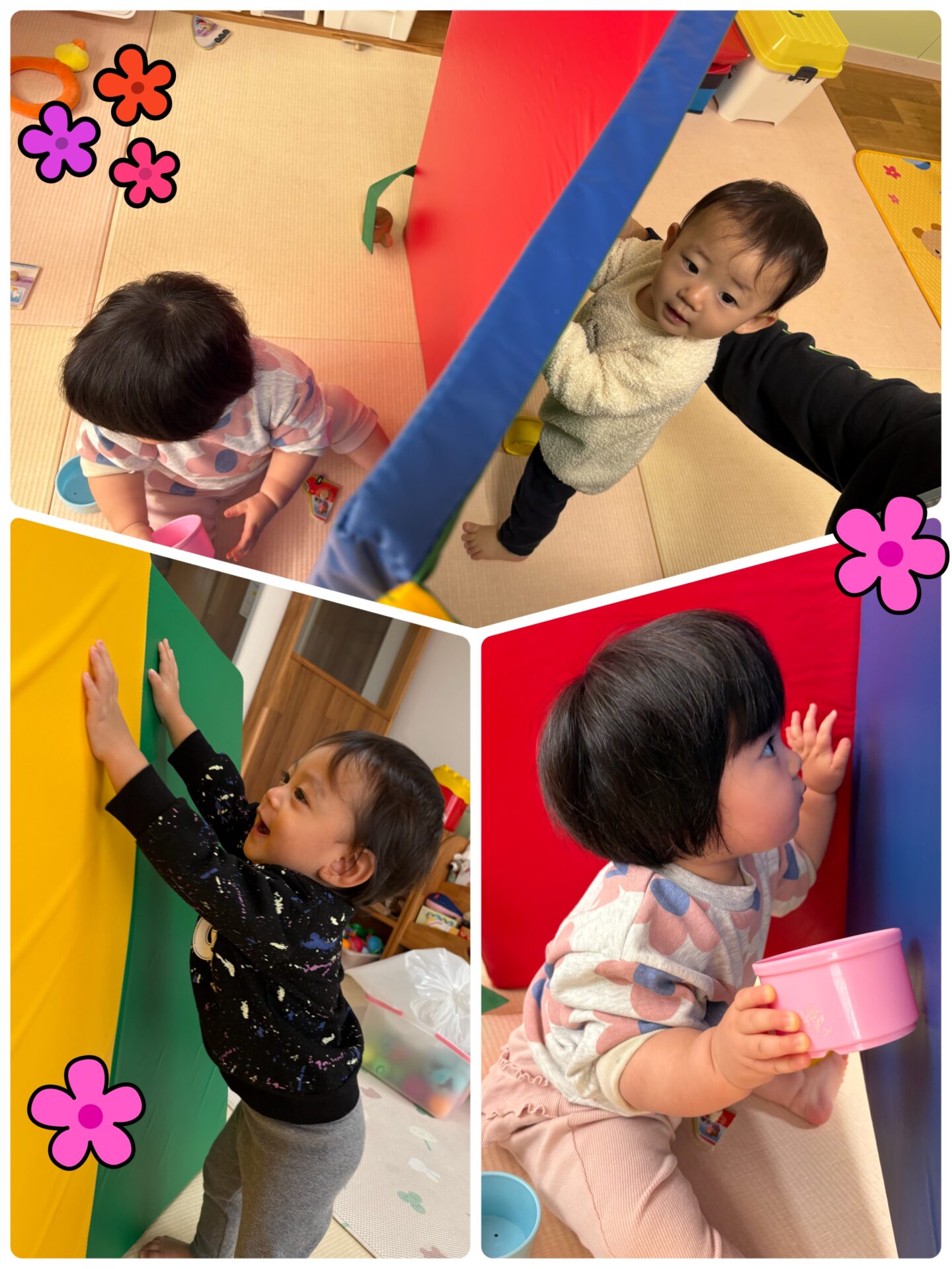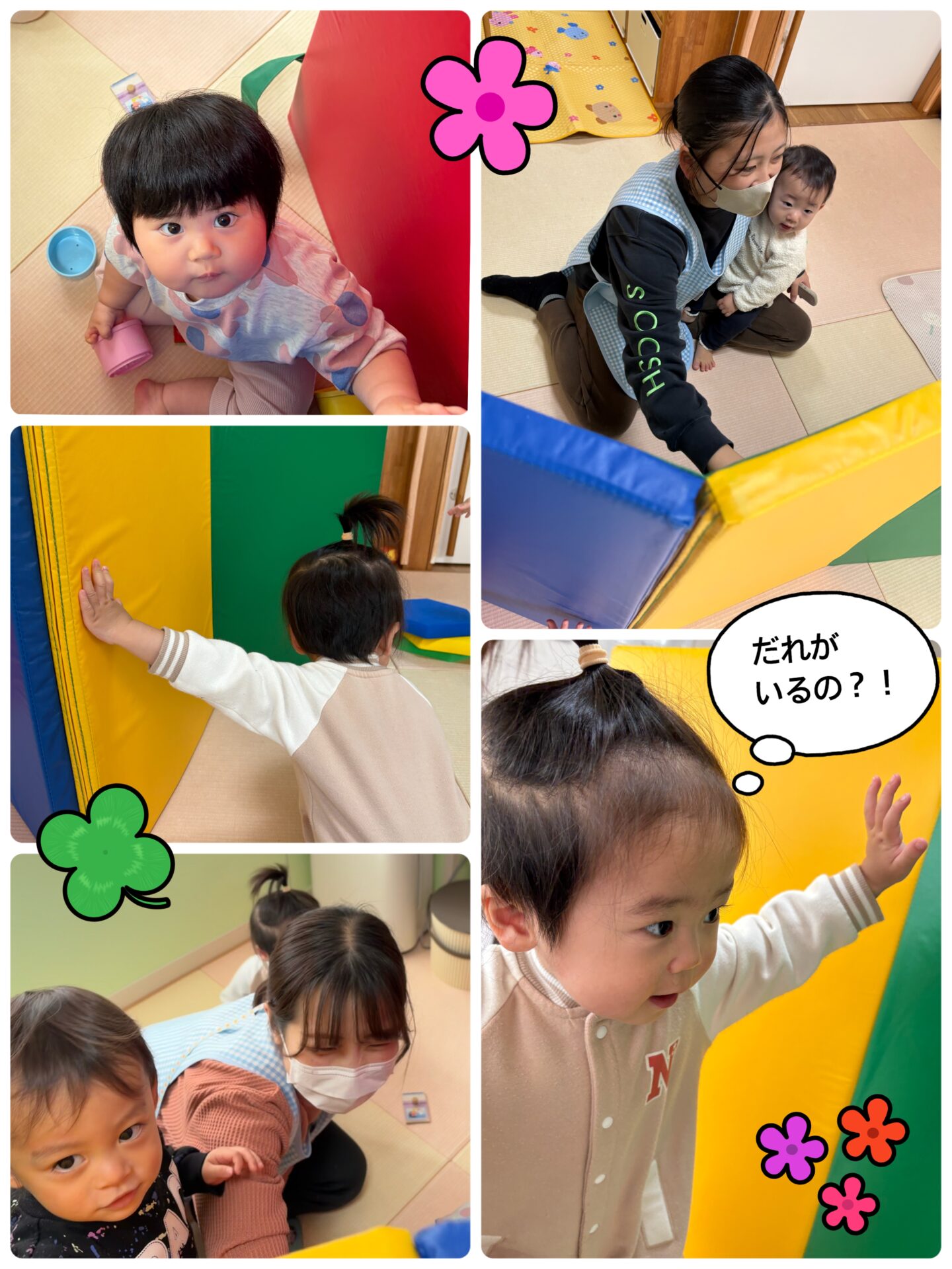その後はマットを立ててみて、両サイドからトントン🚪向こうから音がする?!こちらからもトントン😊向こうには誰がいるの?!と気になる姿が可愛らしかったです♪♪
