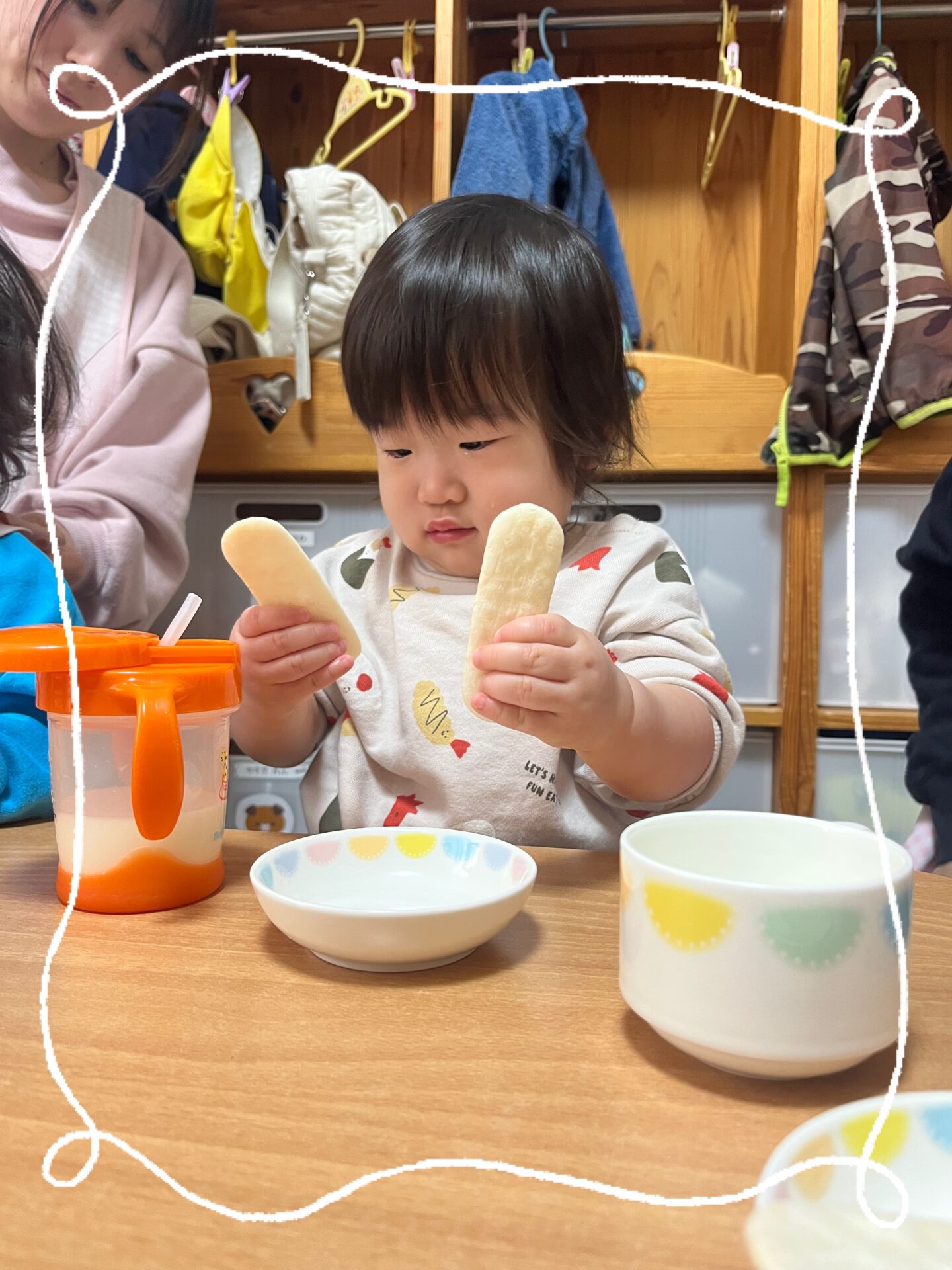 朝の会は少し緊張気味でしたが、おやつの時間になるとにこにこもぐもぐおいしそうに食べてくれました☺️