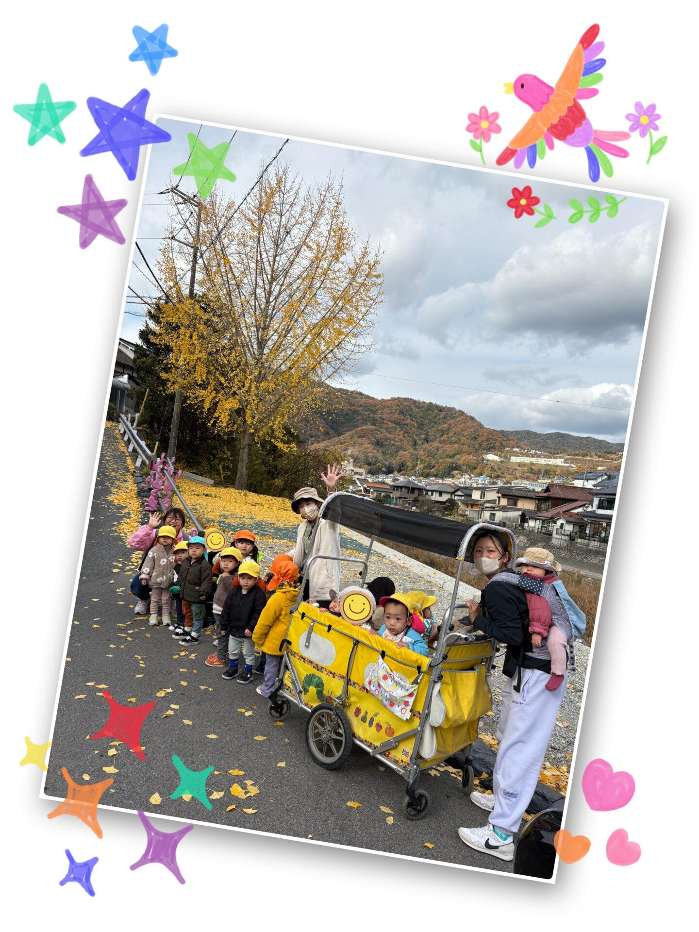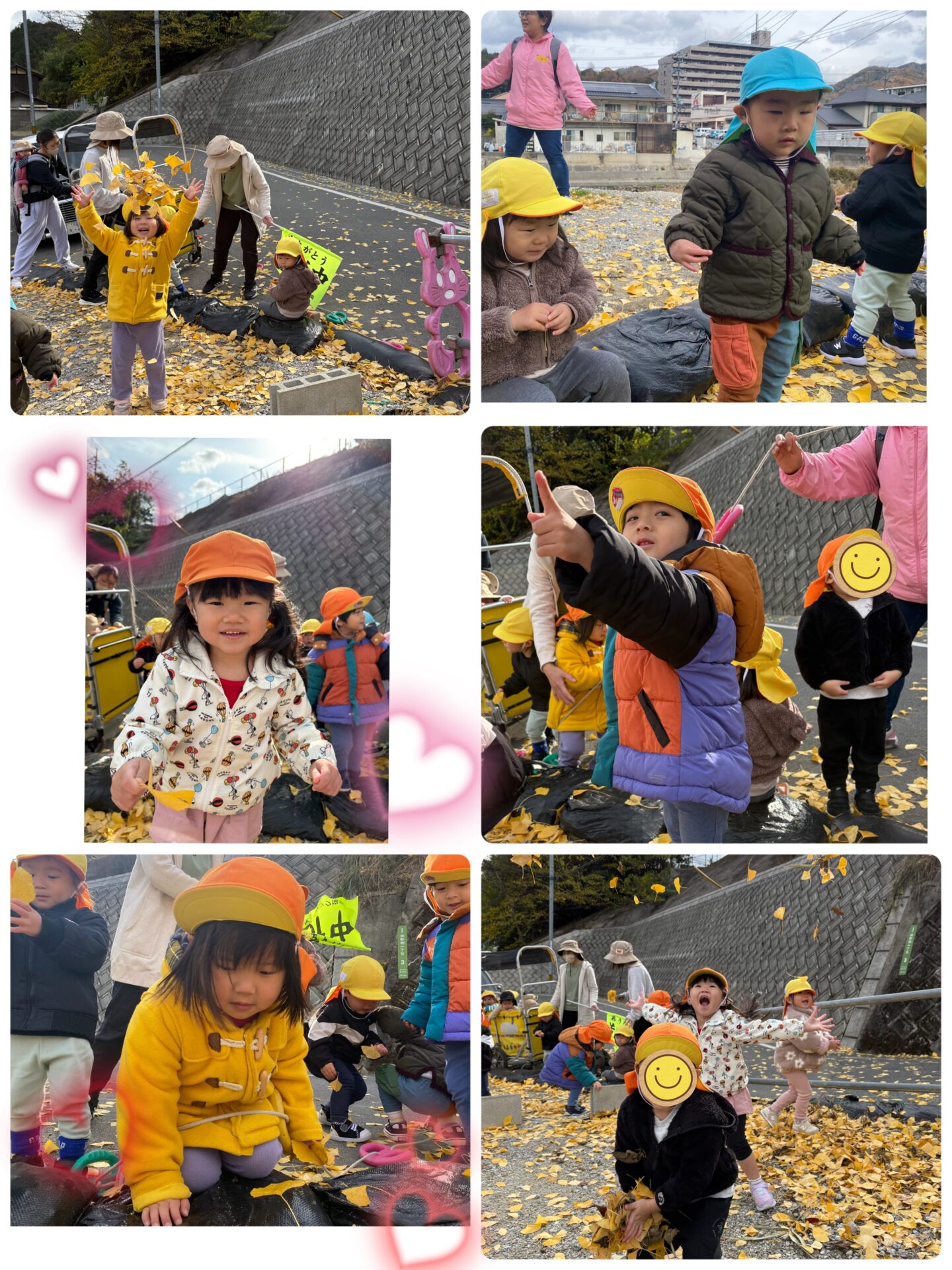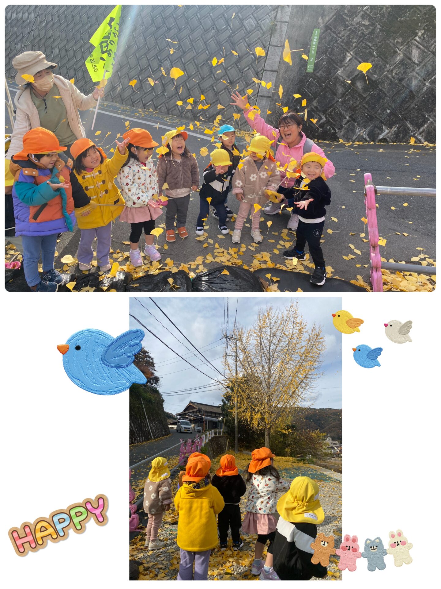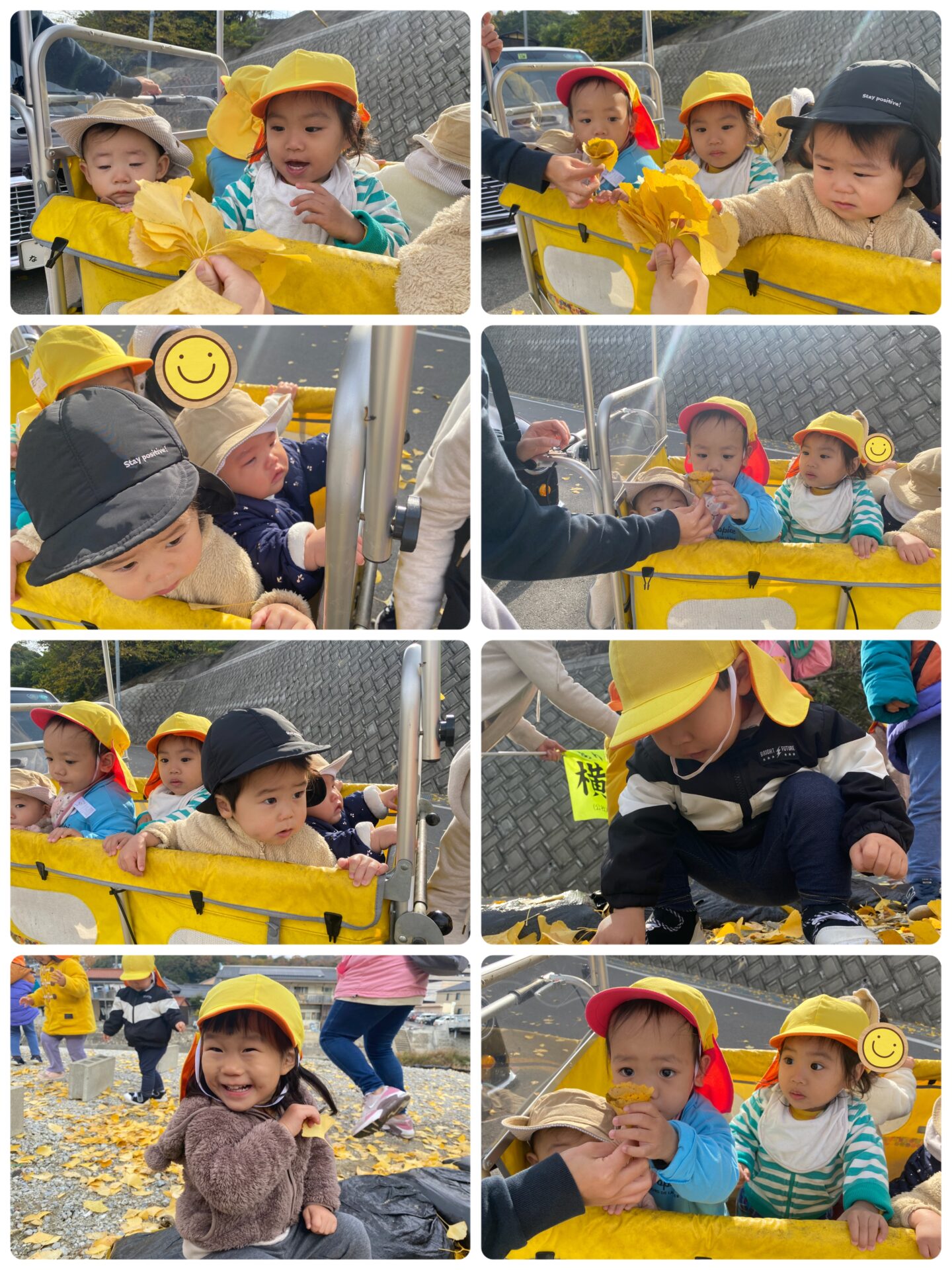 銀杏の木の前に着くと、目の前いっぱいに広がる黄色の世界に「黄色いね!」「こんな形!」と手で形を作りながら、落ち葉をじっくり観察する大きいさん😆足元の“黄色いじゅうたん”にも大喜びでした🤗