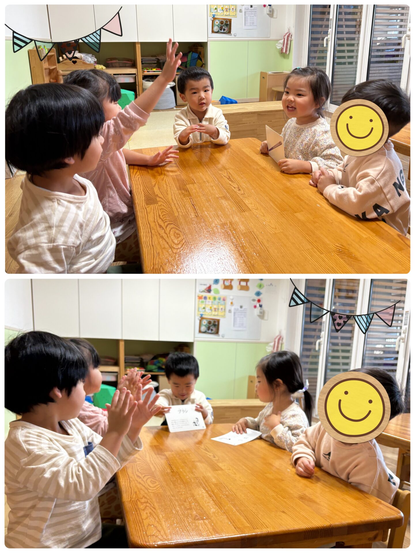 Aちゃんが「ジャーン🤲」とカードをみんなの方へ向けると「はい!はし🥢」と答えるIちゃん⭐︎「せいかーい✨」と拍手をするHくん👏