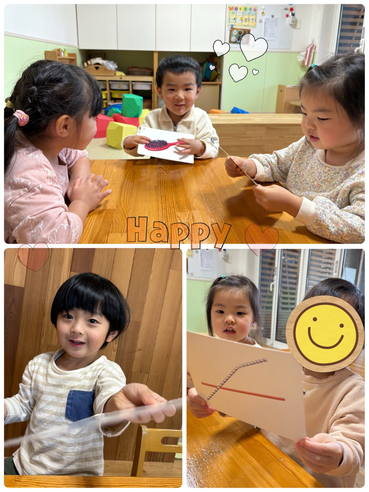 「髪さらさらにするやつ!」とAちゃんやIちゃんが答えてくれました😆「ブラシって言うんだよ」と伝えると、ブラシ♪ブラシ♪とHくんは繰り返して覚えているようでした🌼