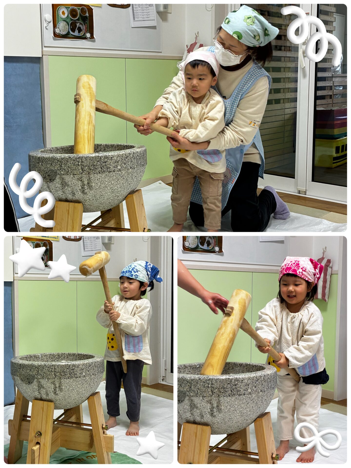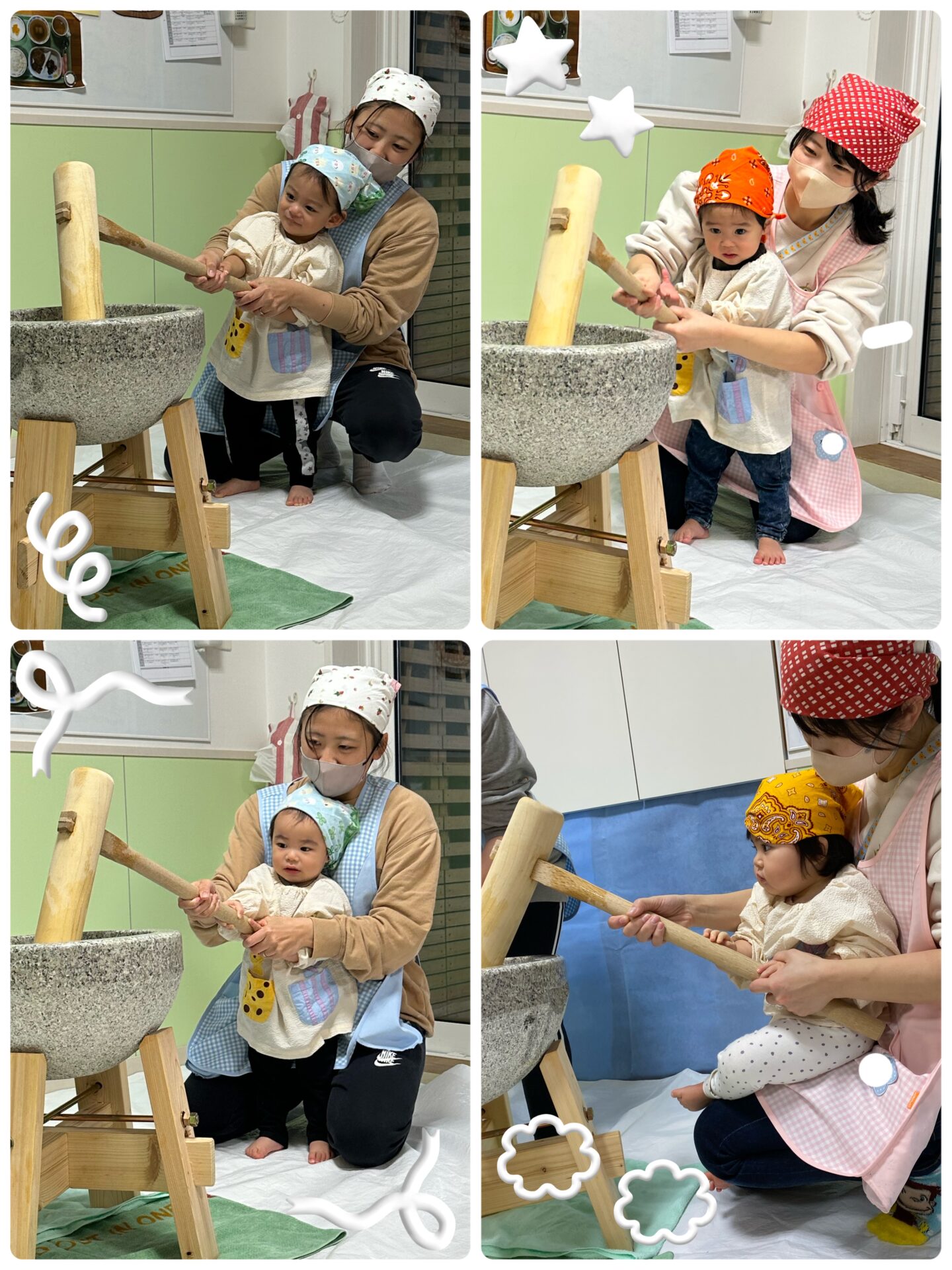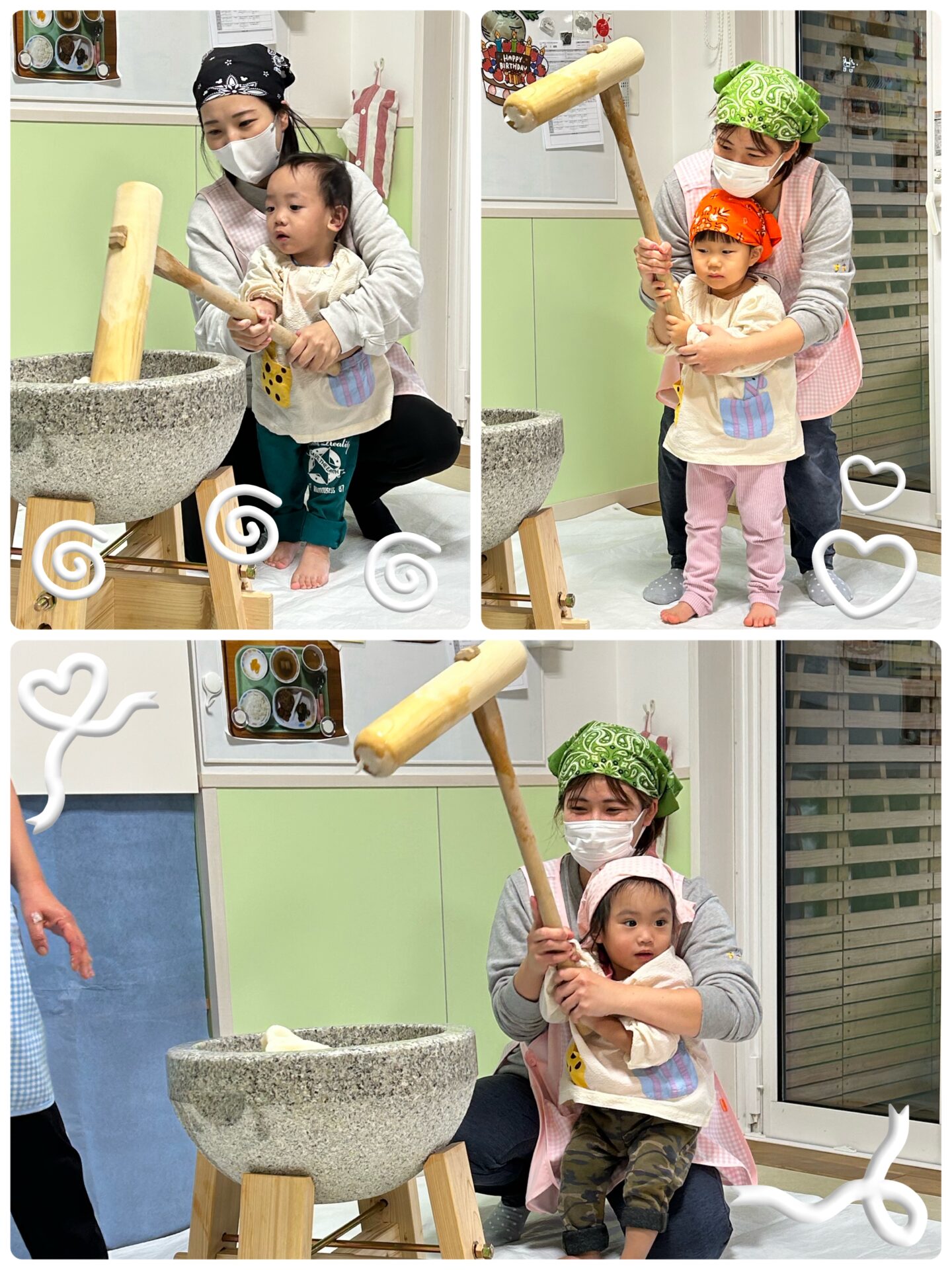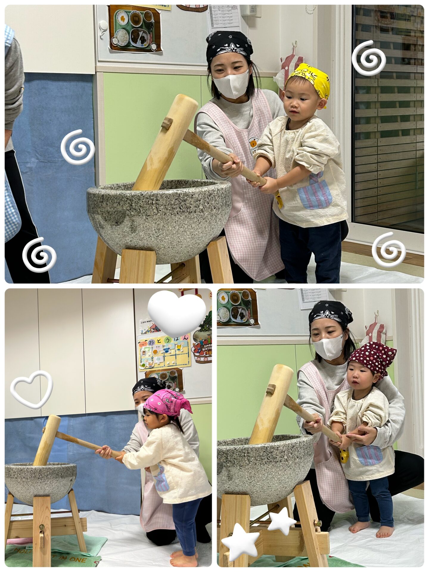 去年は保育者と一緒にぺったんこをしましたが今年は自分から手を伸ばして杵を持とうとする姿があり重たい杵を持ち上げようとしているのも伝わってきました☺️