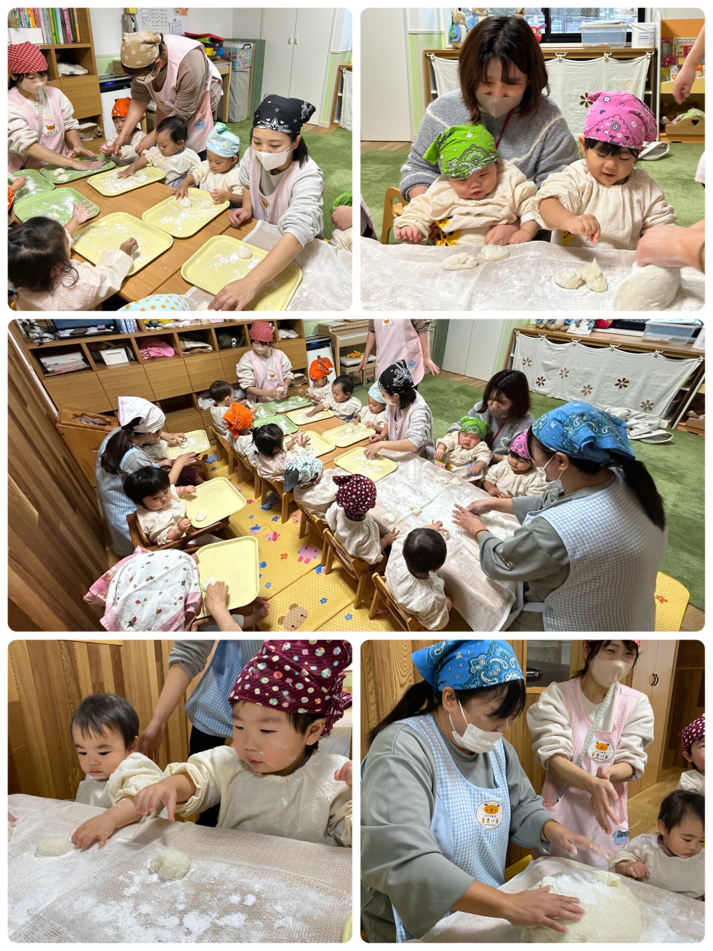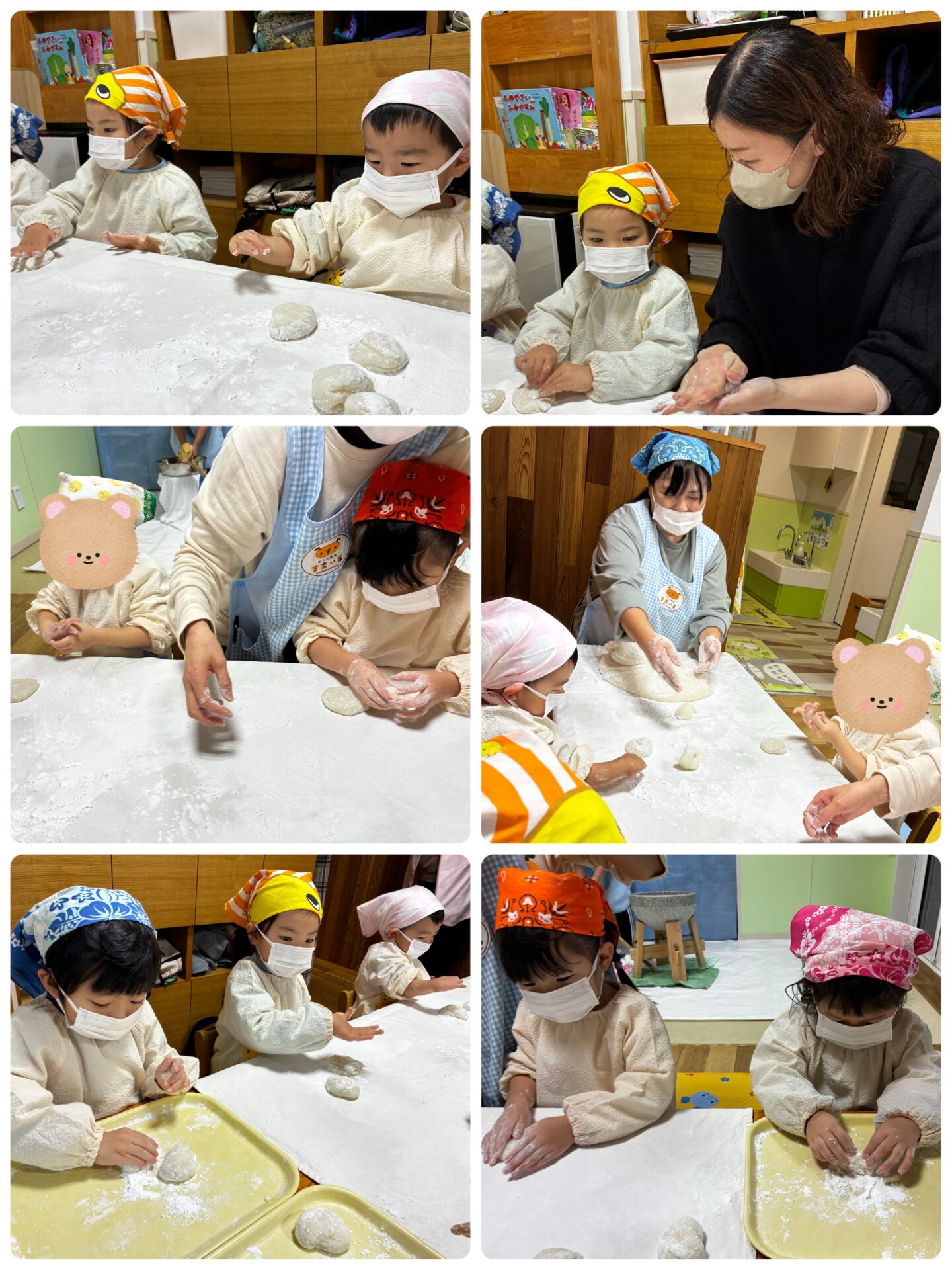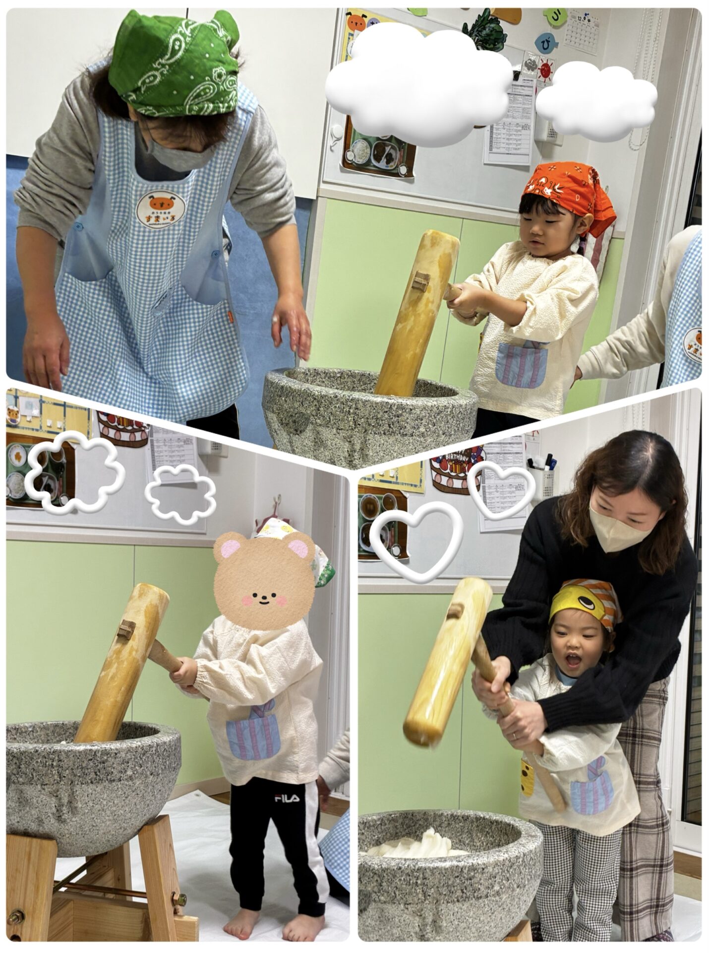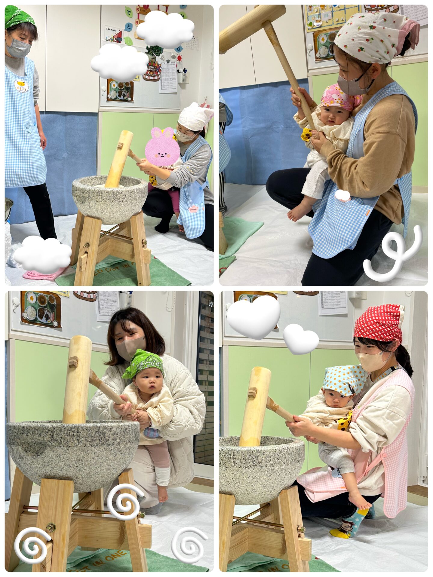 去年は保育者と一緒にぺったんこをしましたが今年は自分から手を伸ばして杵を持とうとする姿があり重たい杵を持ち上げようとしているのも伝わってきました☺️
