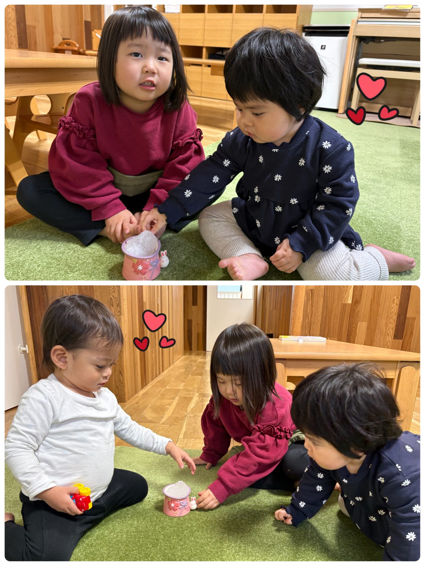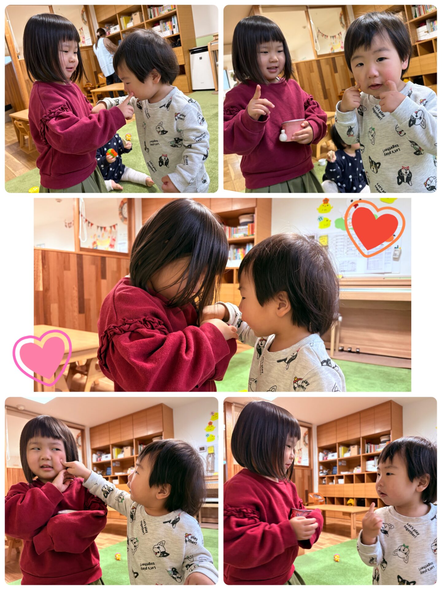 Mくんは、Mちゃんが雪をほっぺにつんっとつけてくれて、びっくり!!自分のほっぺにつんっとつけたり、Mちゃんにお返ししてあげたり💕🥰可愛い2人のやりとりにほっこりした保育者でした🤍