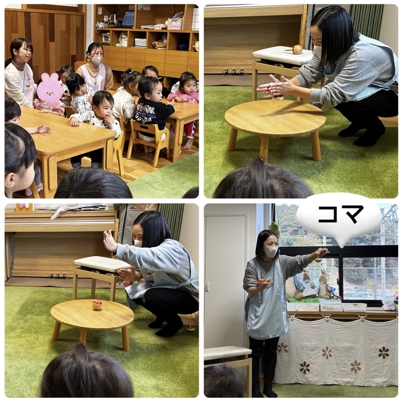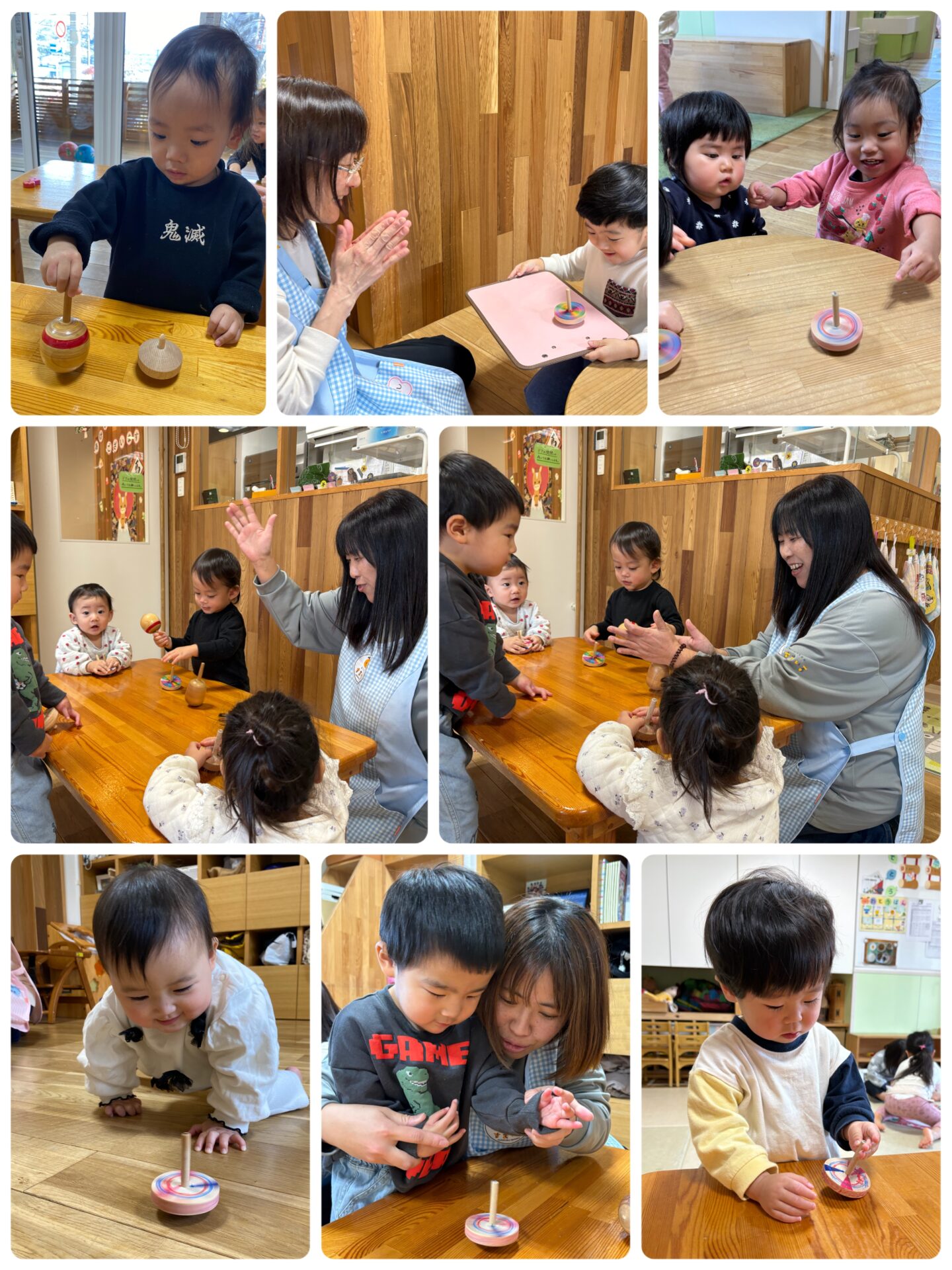 大園長先生がコマを回す姿に釘付けのお友だちです💗