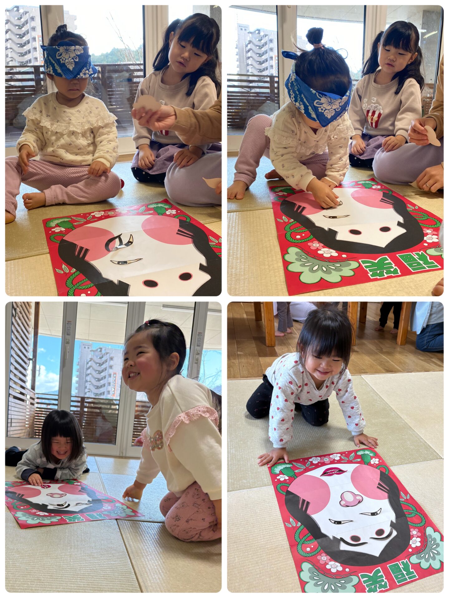 今日は、コマ回し/だるまおとし/福笑い/絵カルタを行いました。