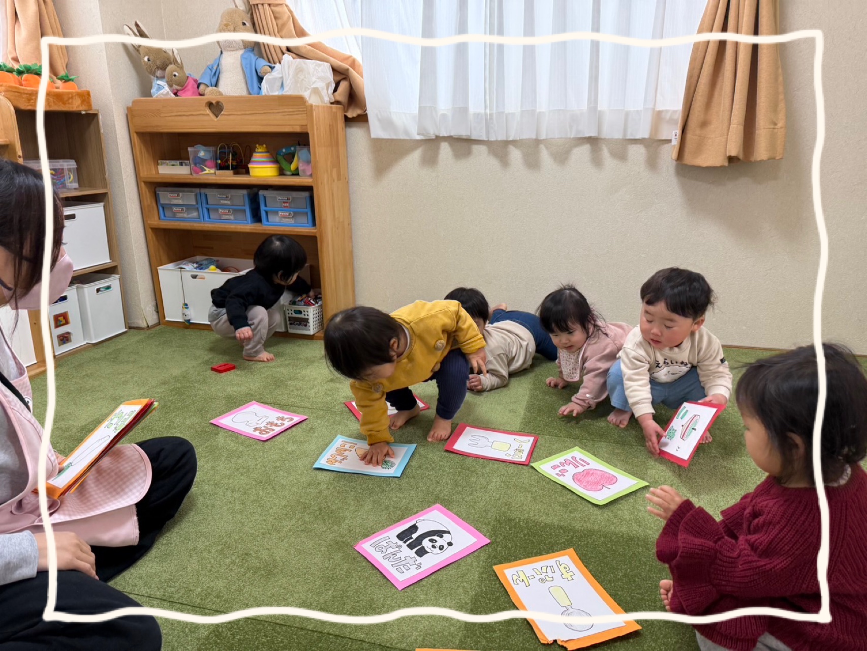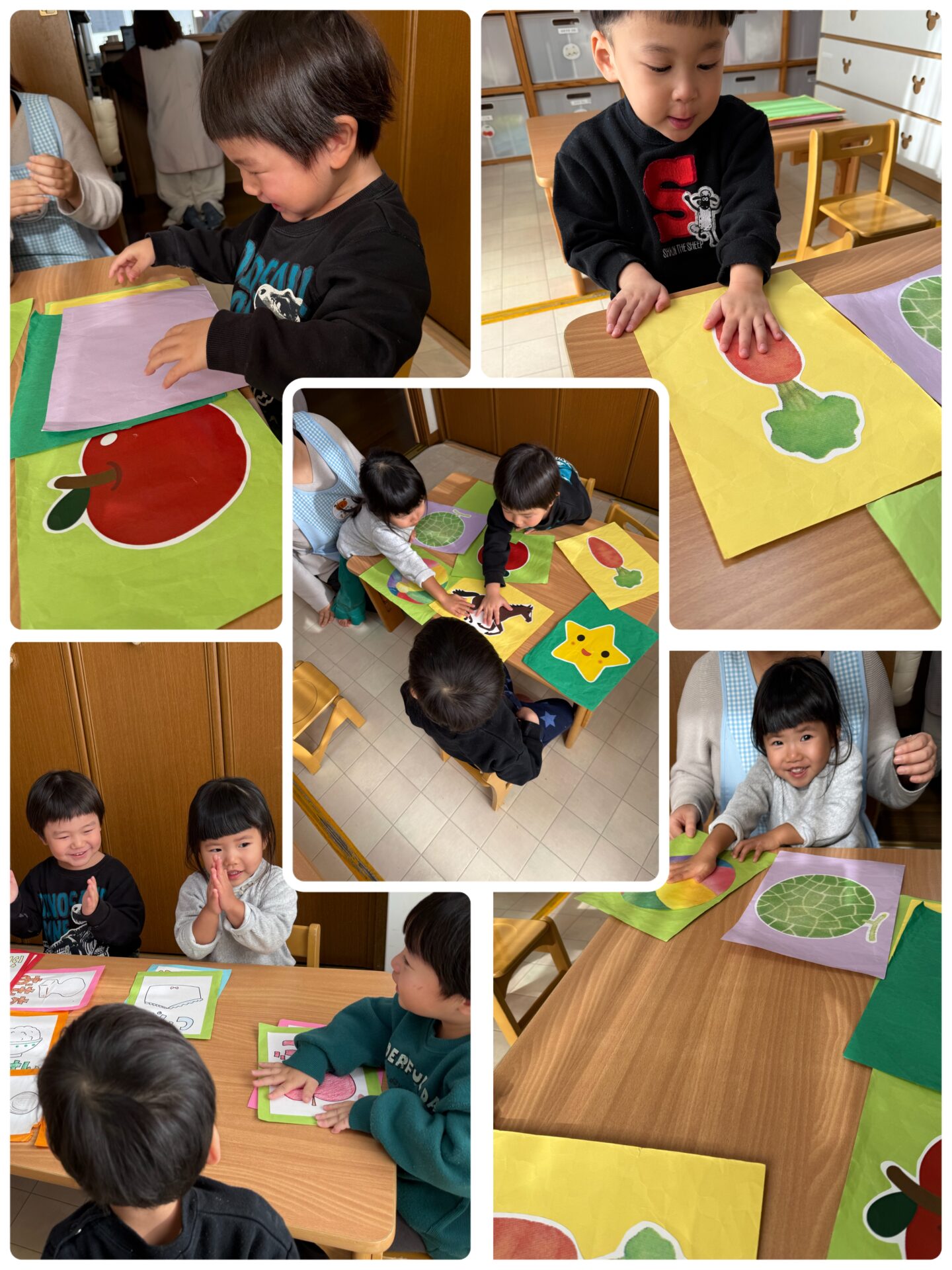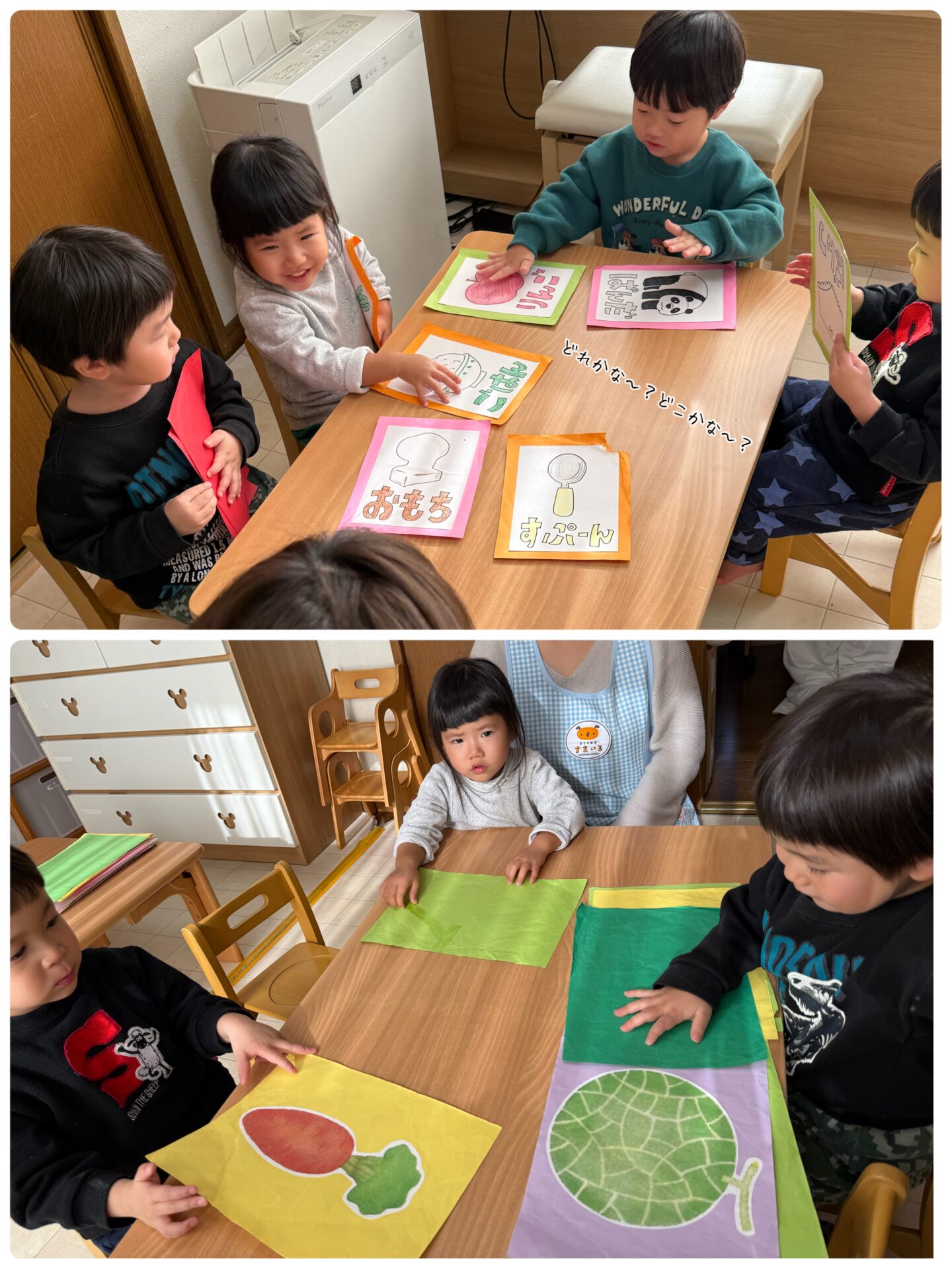 今年の干支の午🐎などの動物の絵や、普段身近なスプーンやフォークなどの絵札を前に、みんなワクワクとドキドキ💞