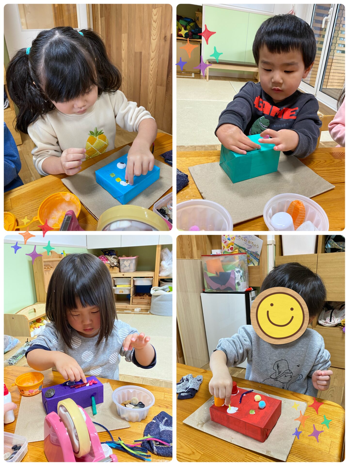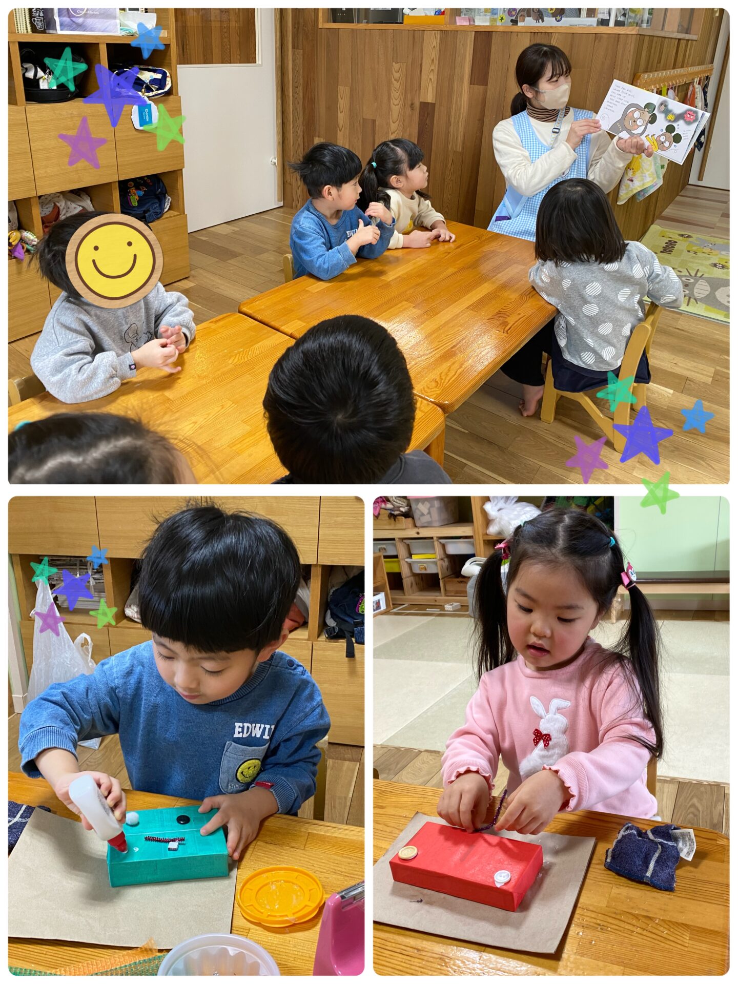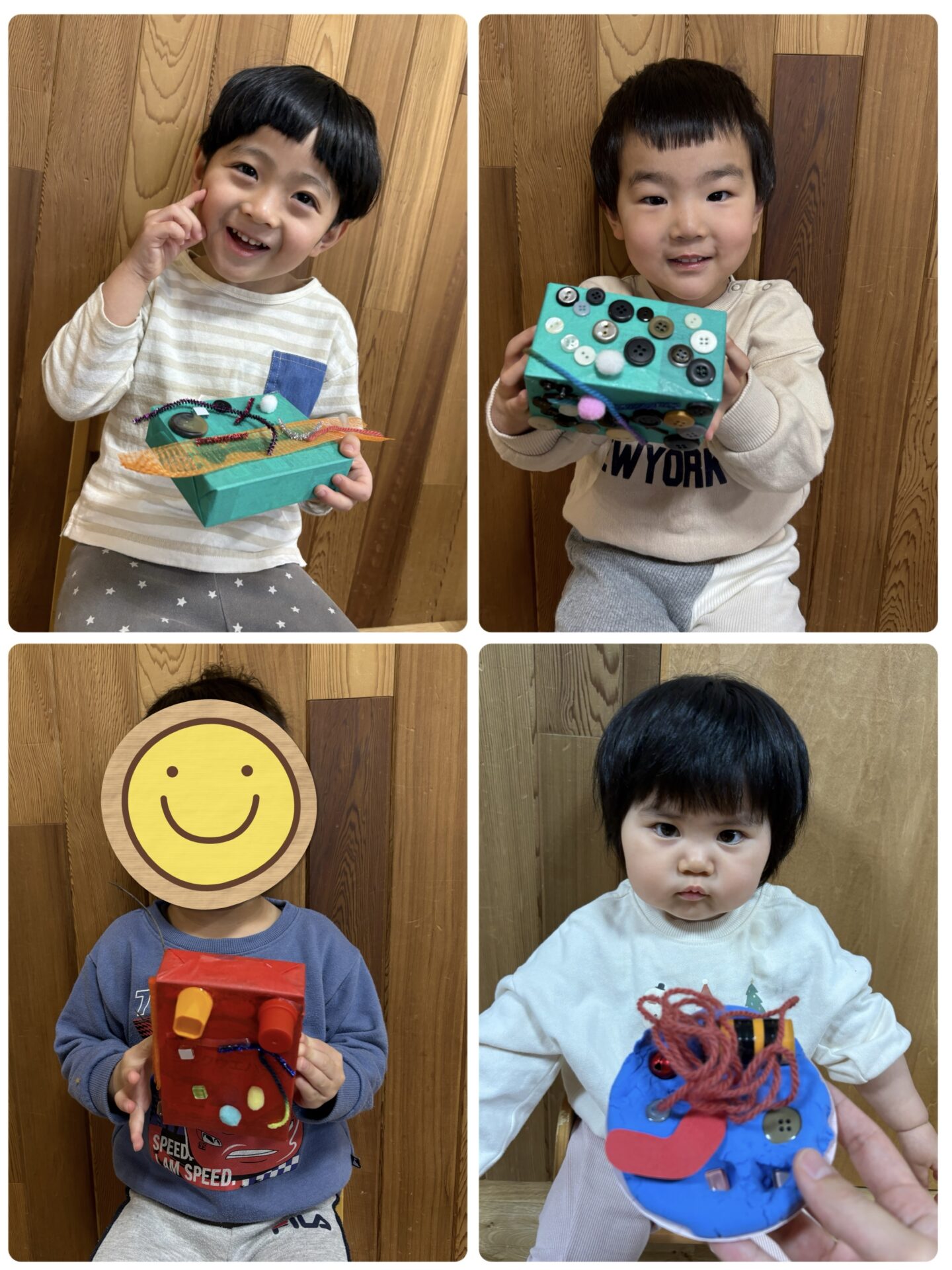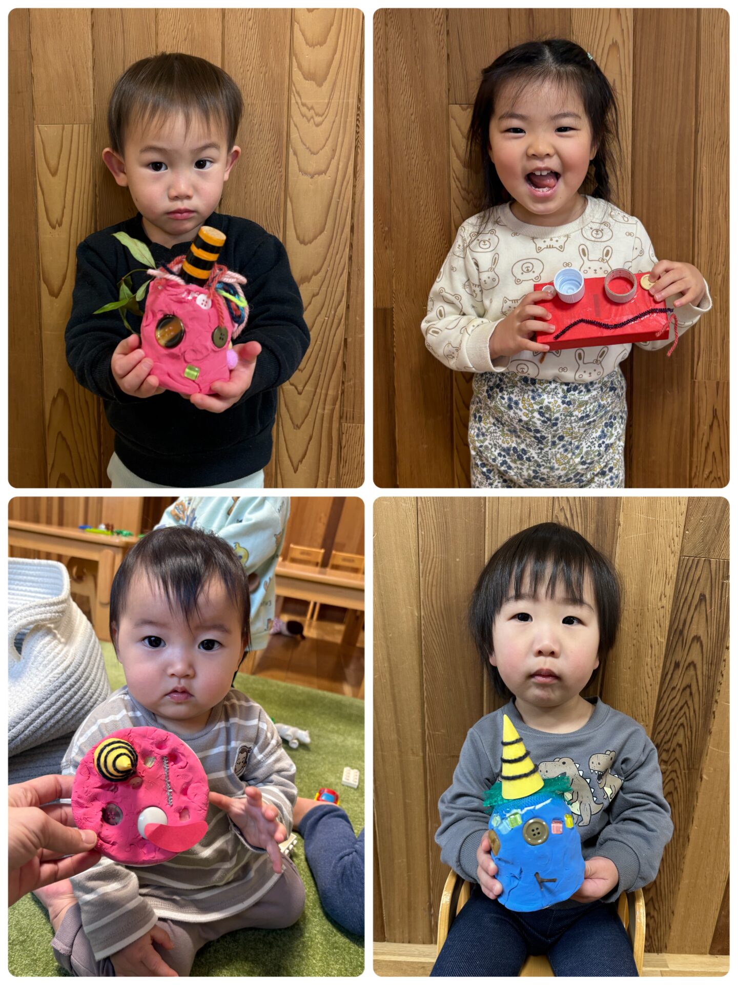 のりでもくっつかないものは…ボンド使う!と、ボンドに変更🌟ボンドにすると「くっついたよ😆」と嬉しそうでした!発見がたくさんあるね🌼出来上がった後、嬉しくて嬉しくて仕方ない大きいさん達🧡完成した鬼さんのことを保護者の方に、たくさんお話ししていたね!毎日楽しいお話が玄関から聞こえてきました🥰