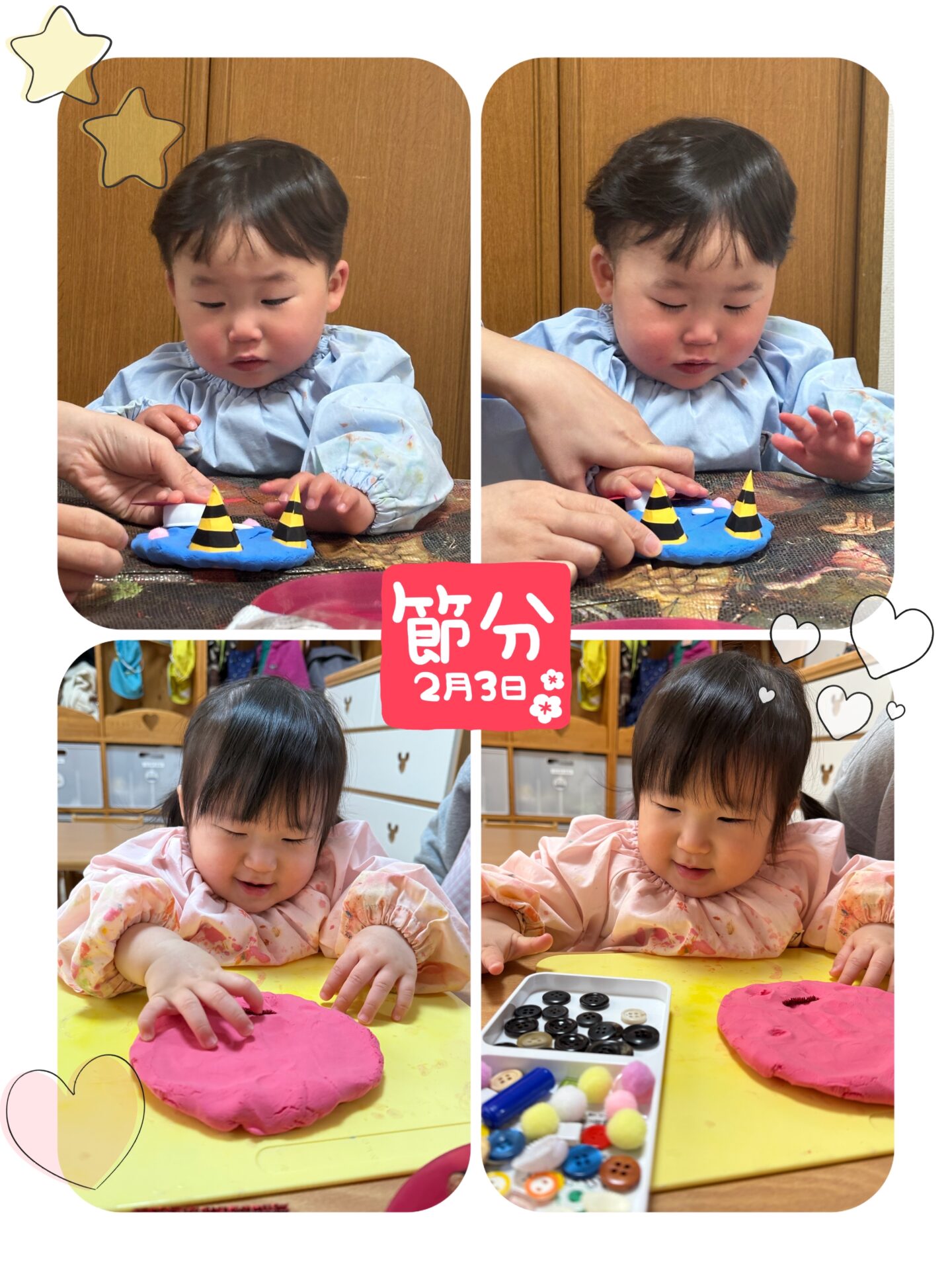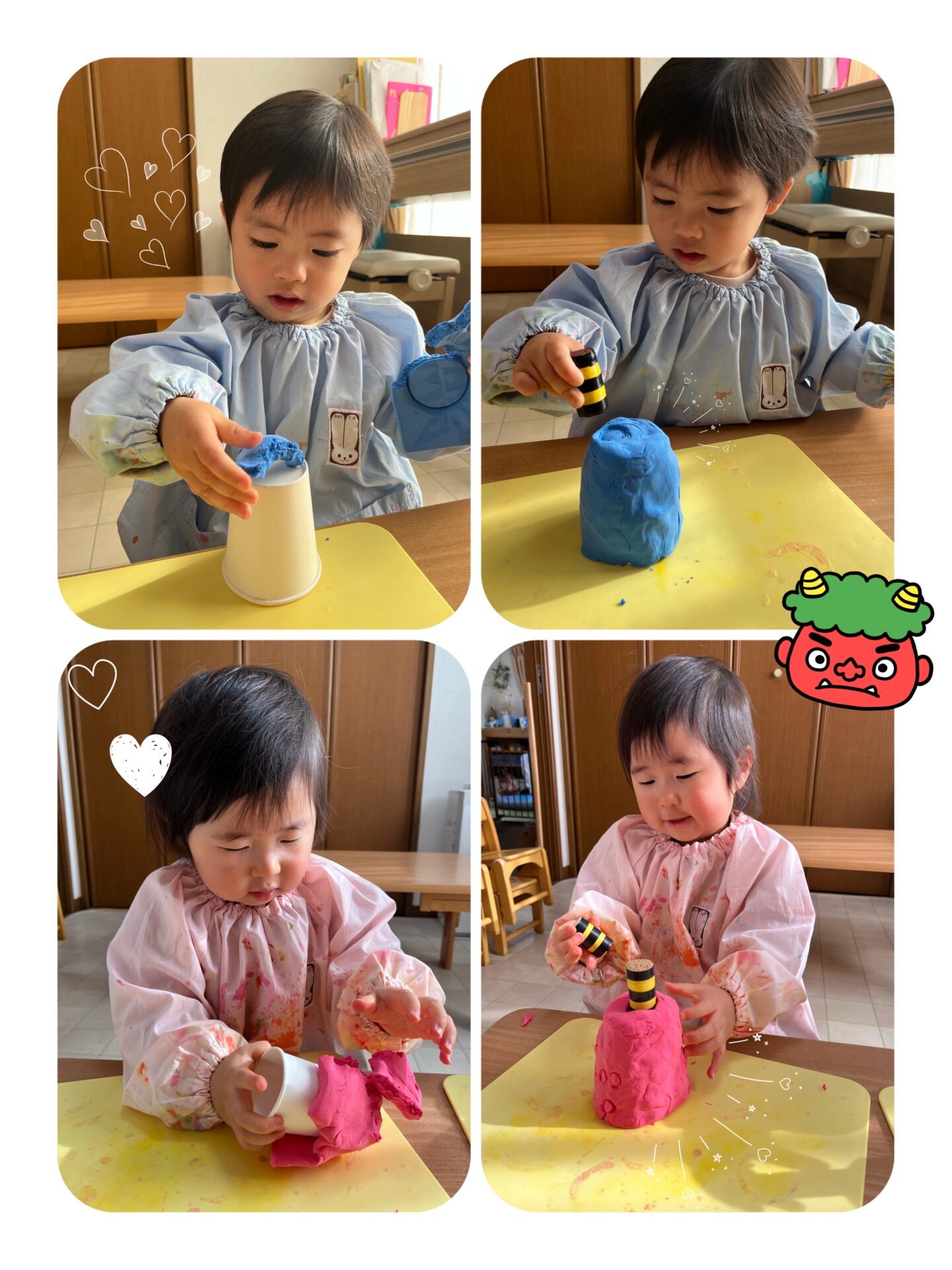 1歳児さんのふたりは、紙コップに粘土を貼り付けて、鬼さんを作りました👀