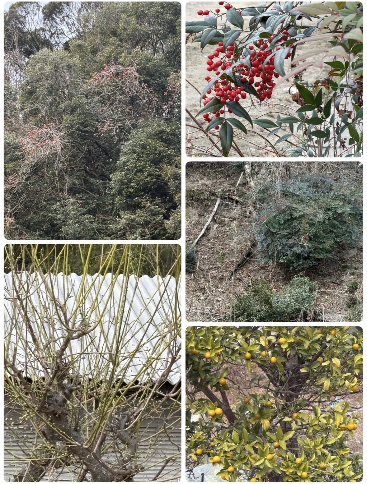 他にも、梅の花のつぼみがあったり、きんかん、赤い葉っぱ!カラス🐦⬛などなど…