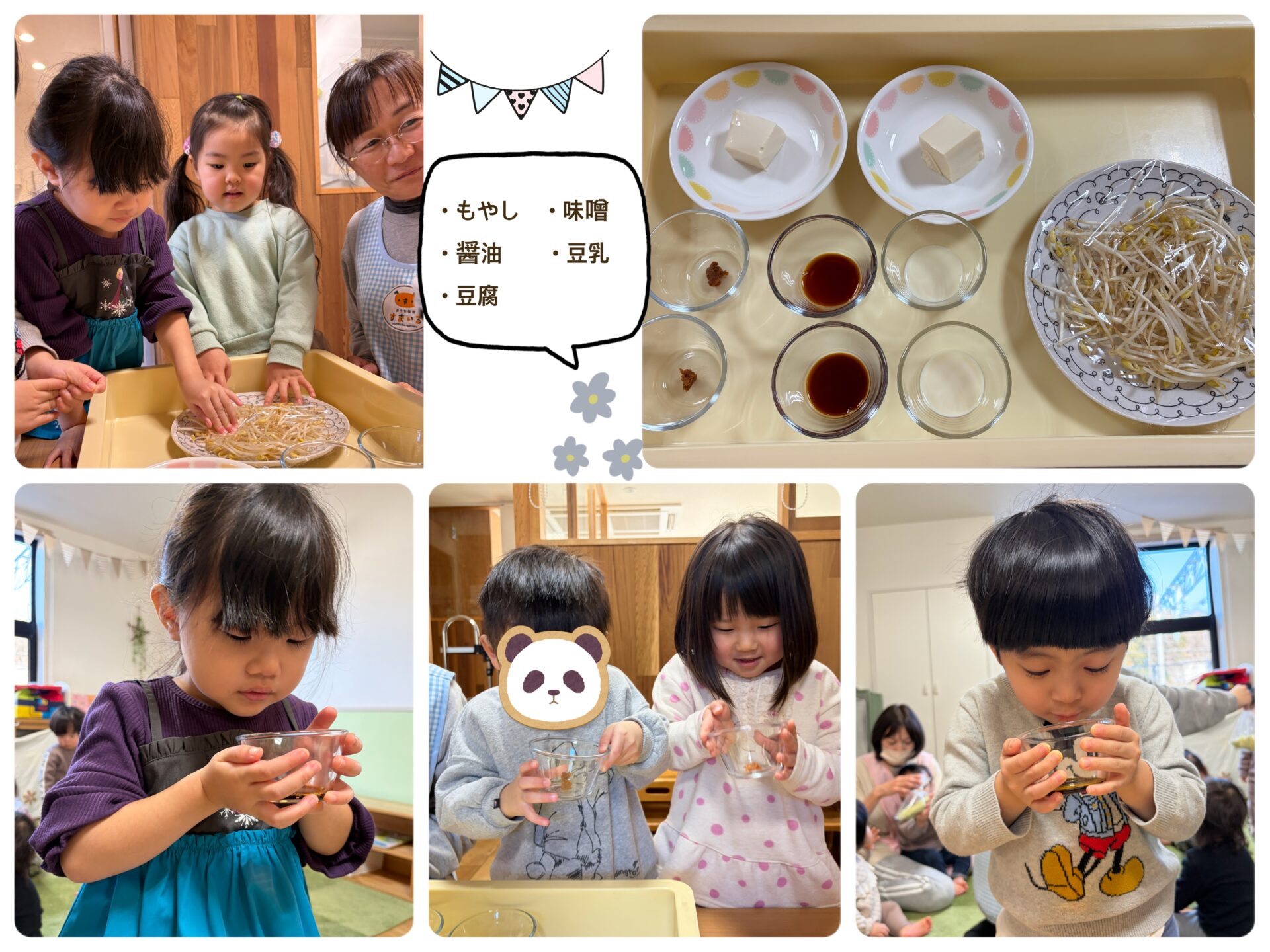 大豆やきな粉、お味噌、お醤油、もやし、お豆腐を実際に触ったりくんくん匂ってみたよ😋