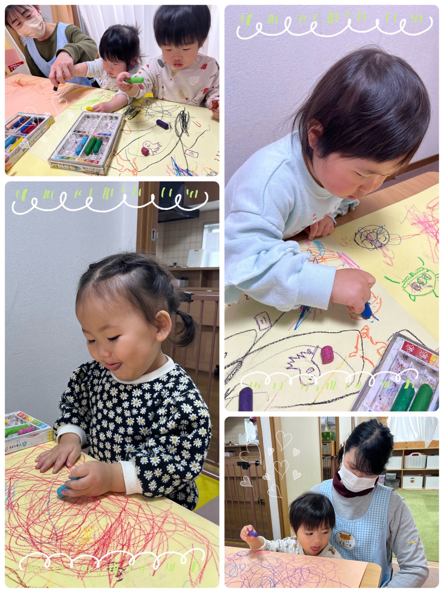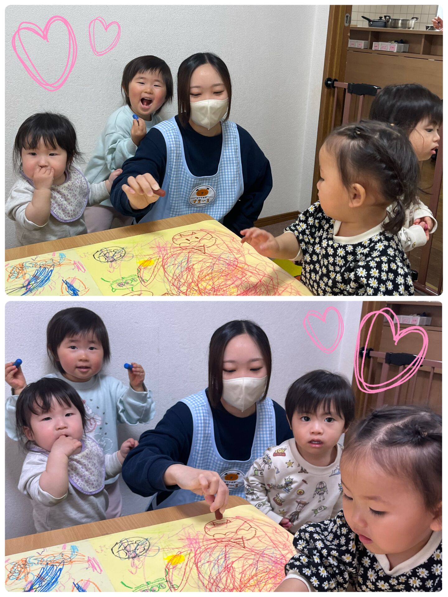 大きいさんが冒険遠足に行っている間、お部屋でお留守番していた小さいさんたちは、机いっぱいの画用紙にお絵かきを楽しみました😄