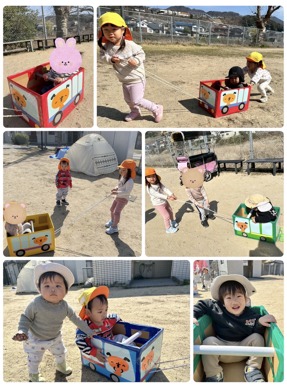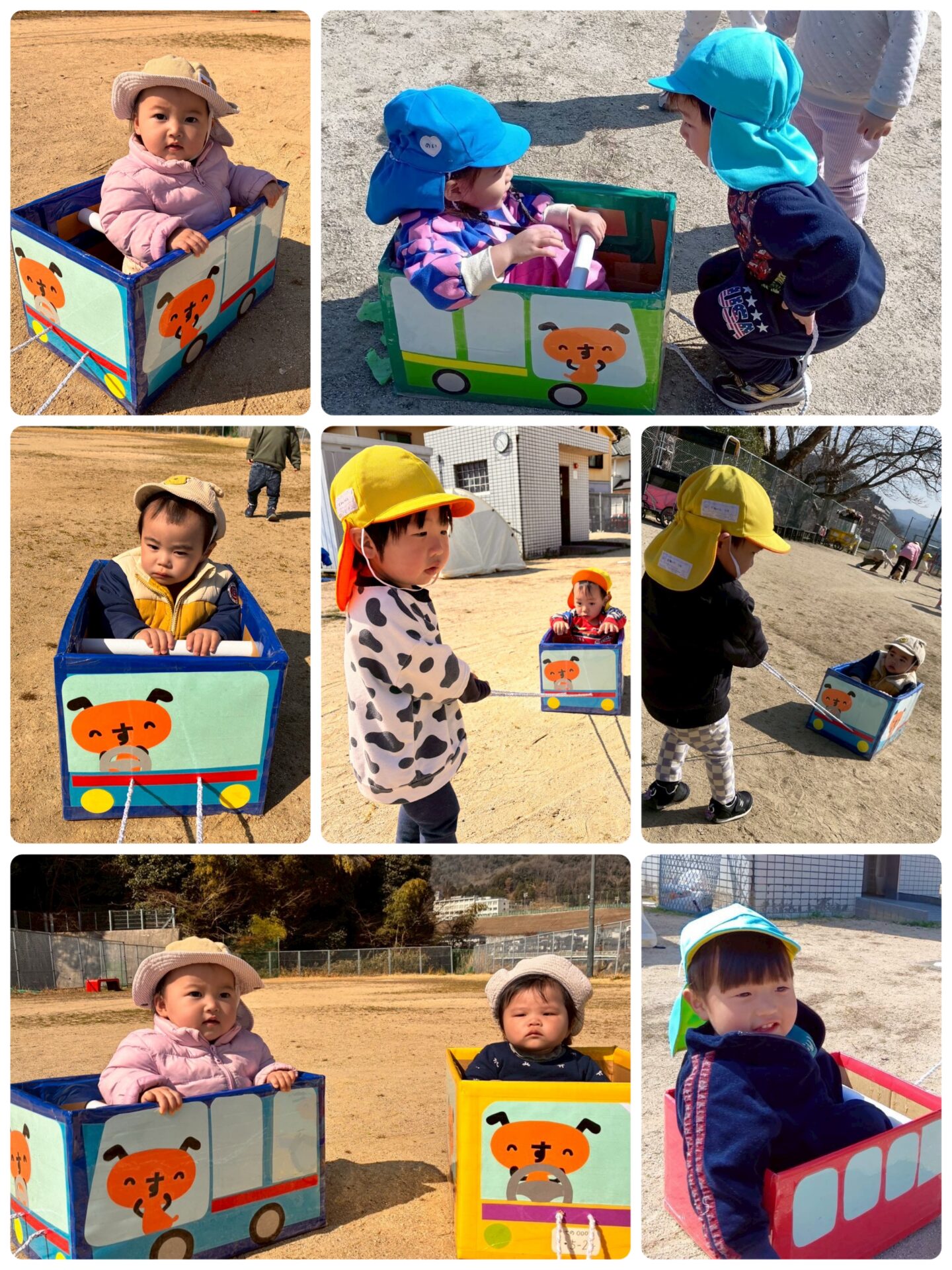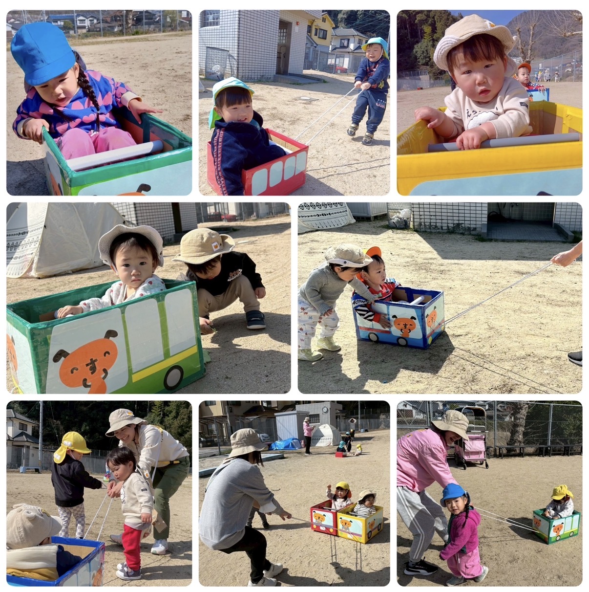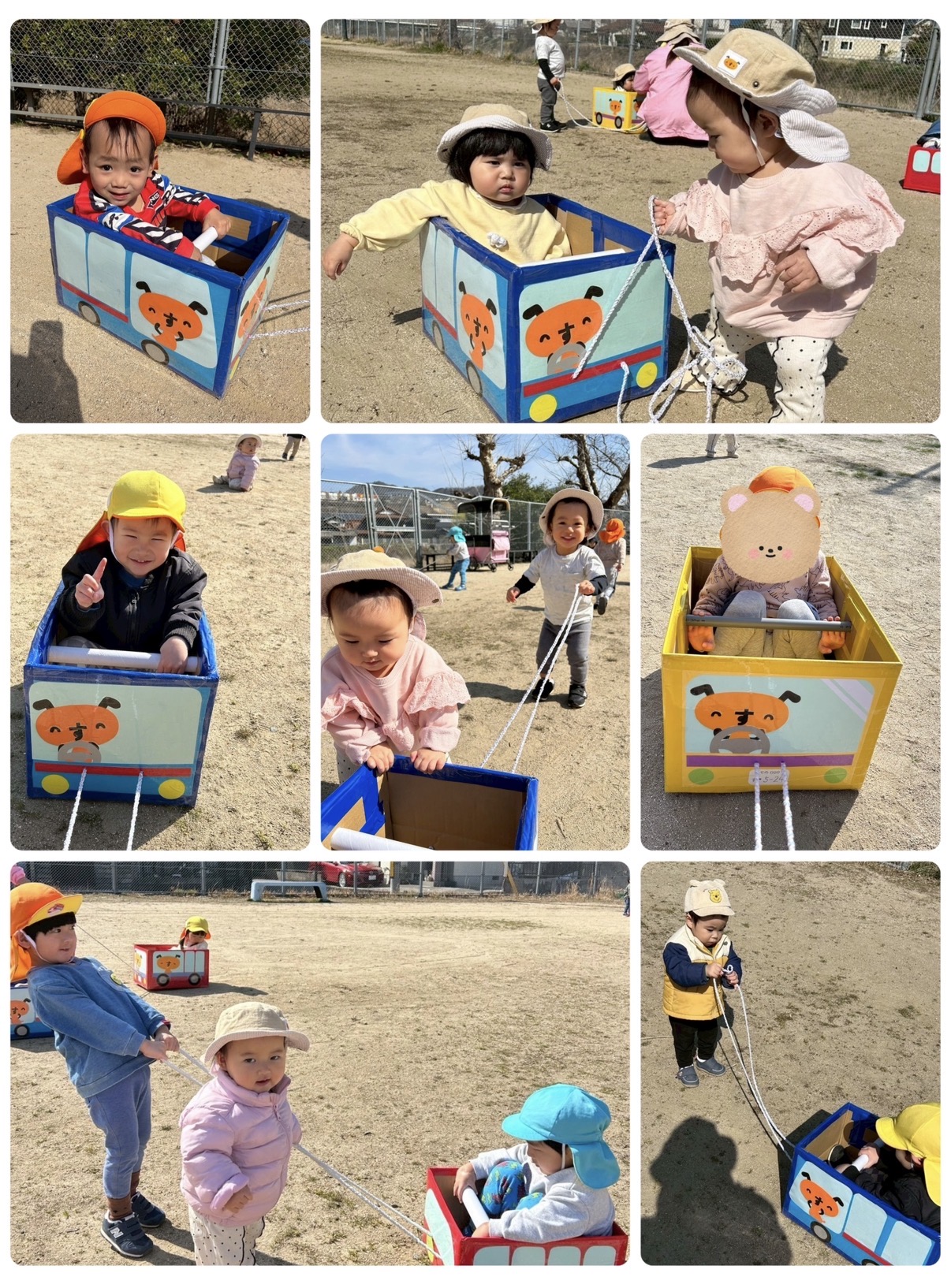 ダンボール列車ではお友だちと交代でなったら引っ張ったりしながら、ガタゴトガタゴト出発進行!みんなで仲良く乗りましたよ♪
