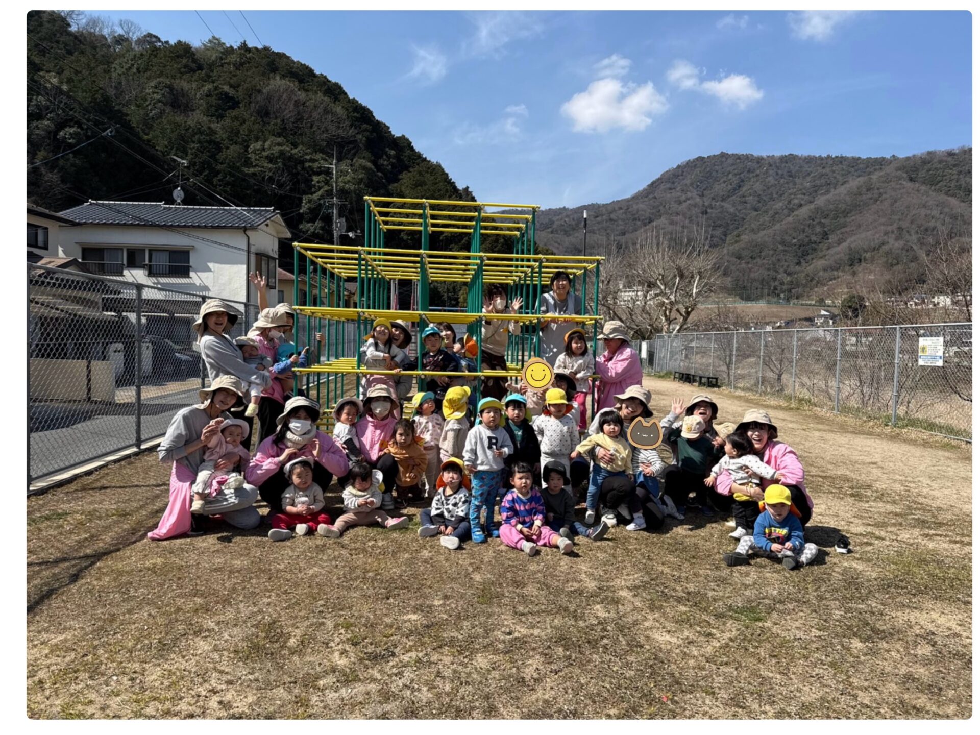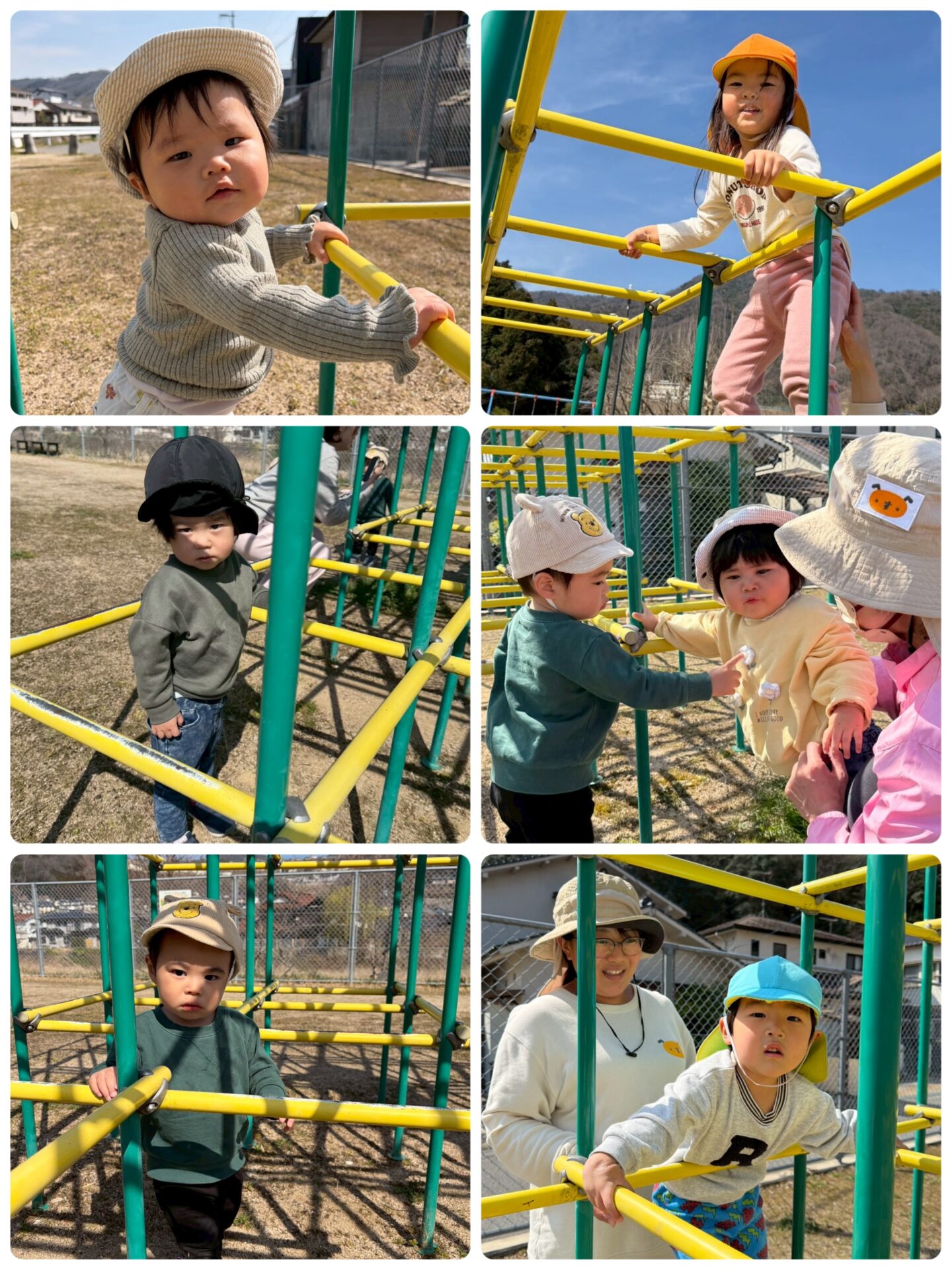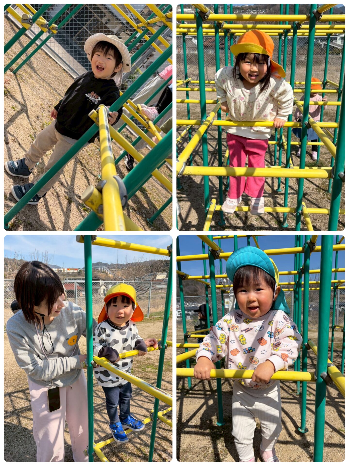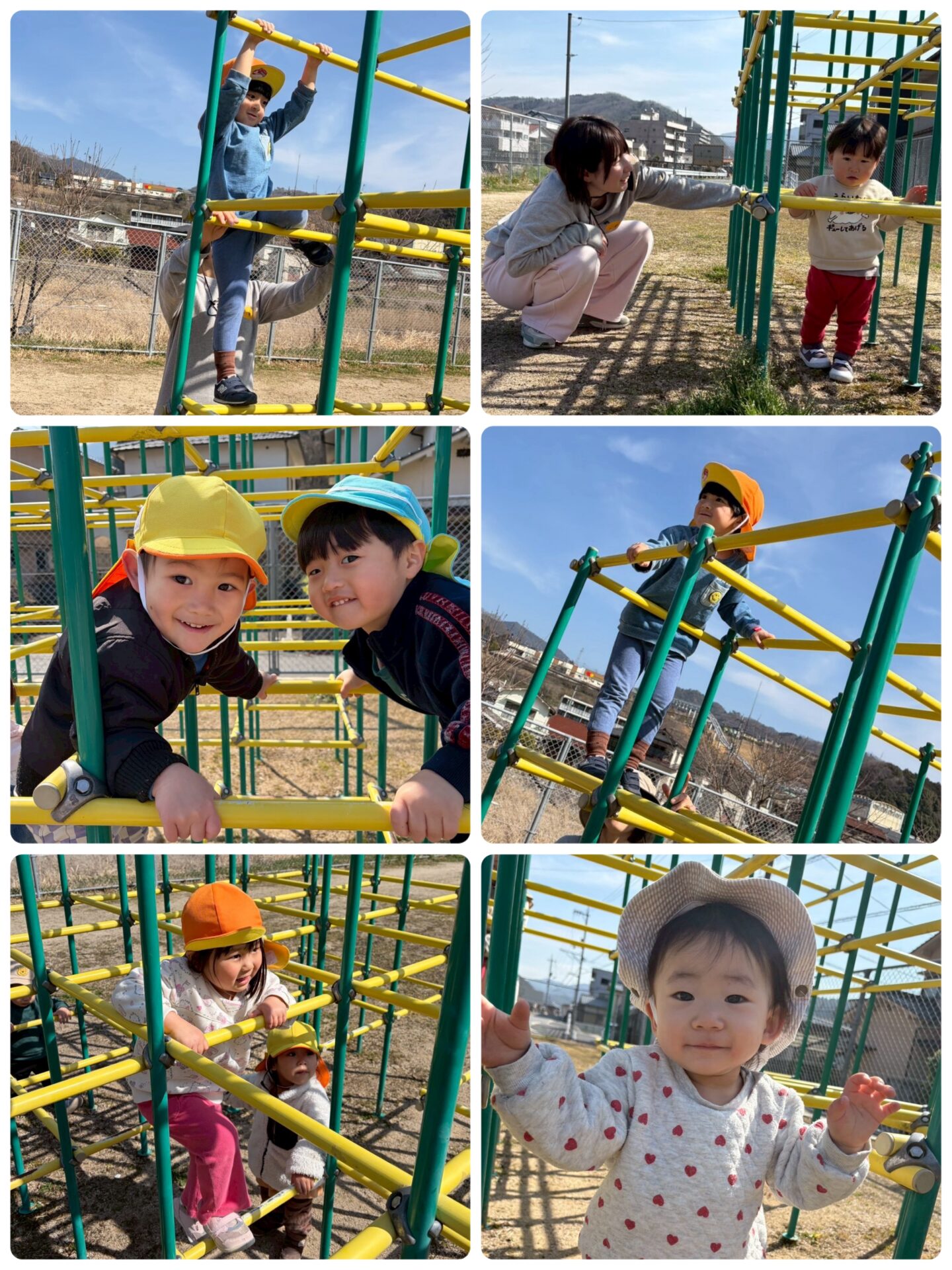 ジャングルジムでは、1番上まで登った先生を見て、「ぼくも!」「わたしも!」と、みんな足を大きく上げながら頑張って登りました☀️
