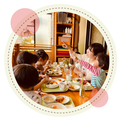 | 食事 | 給食(自園調理)、午前・午後おやつ、補助食を用意。 すまいるには調理員2名が在籍していますので、毎日栄養のあるできたての給食を提供しています。 |